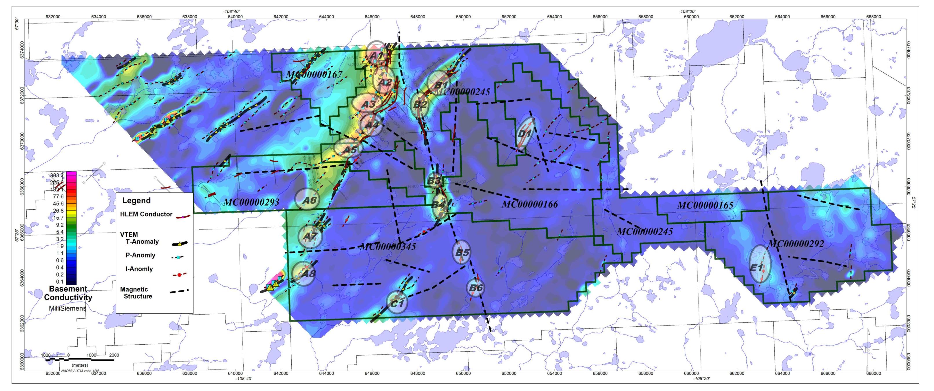 The Main Grid shows multiple long linear conductors with flexural changes in orientation and offset breaks in the vicinity of interpreted fault lineaments – classic targets for basement-hosted unconformity uranium deposits. These are not just simple basement conductors; they are clearly upgraded/enhanced prospectivity targets because of the structural complexity.