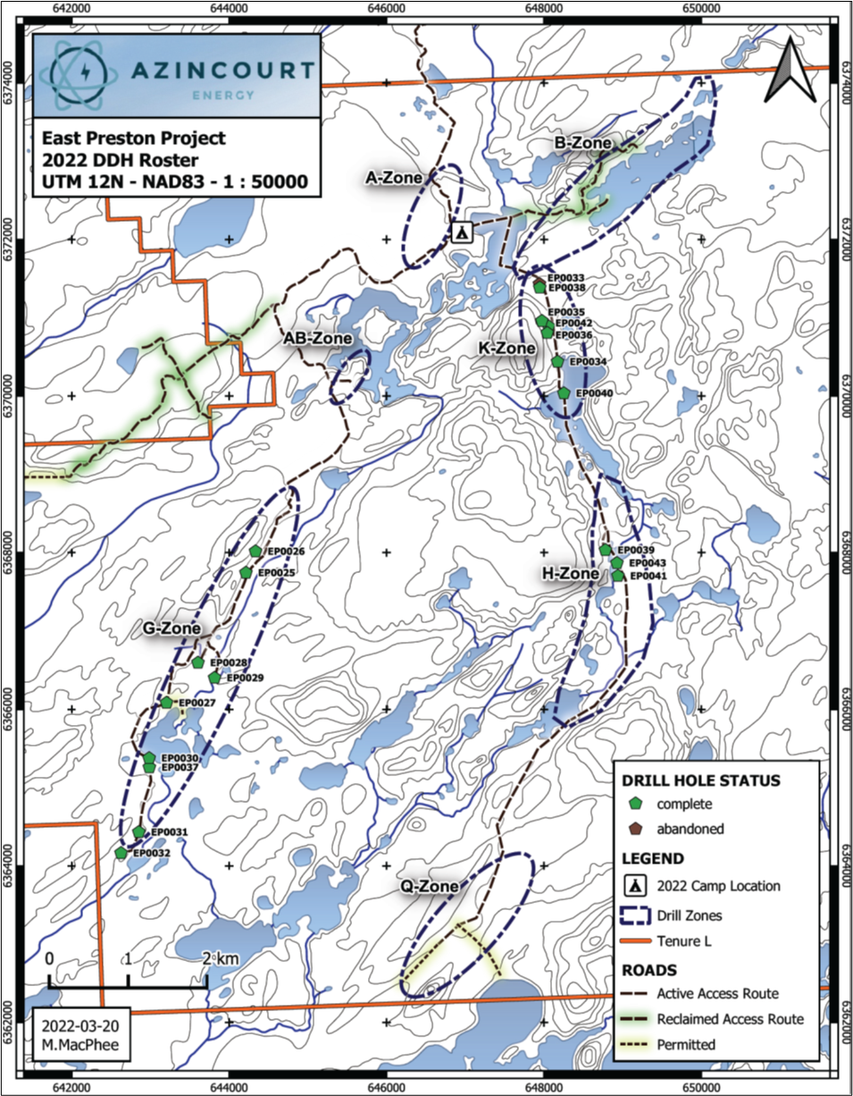Preparations continue for the winter program at the East Preston project. Permits and approval for the program have been received and Azincourt will continue to work with the Clearwater River Dene Nation (CRDN) and local communities to ensure opportunities for local businesses and employment are maximized.