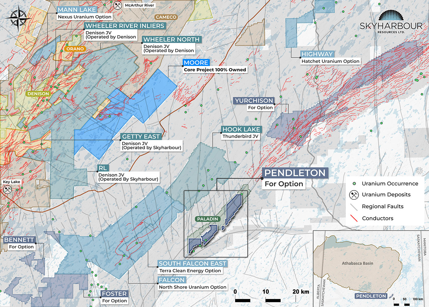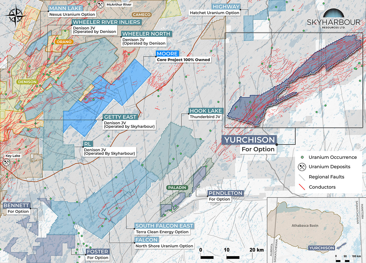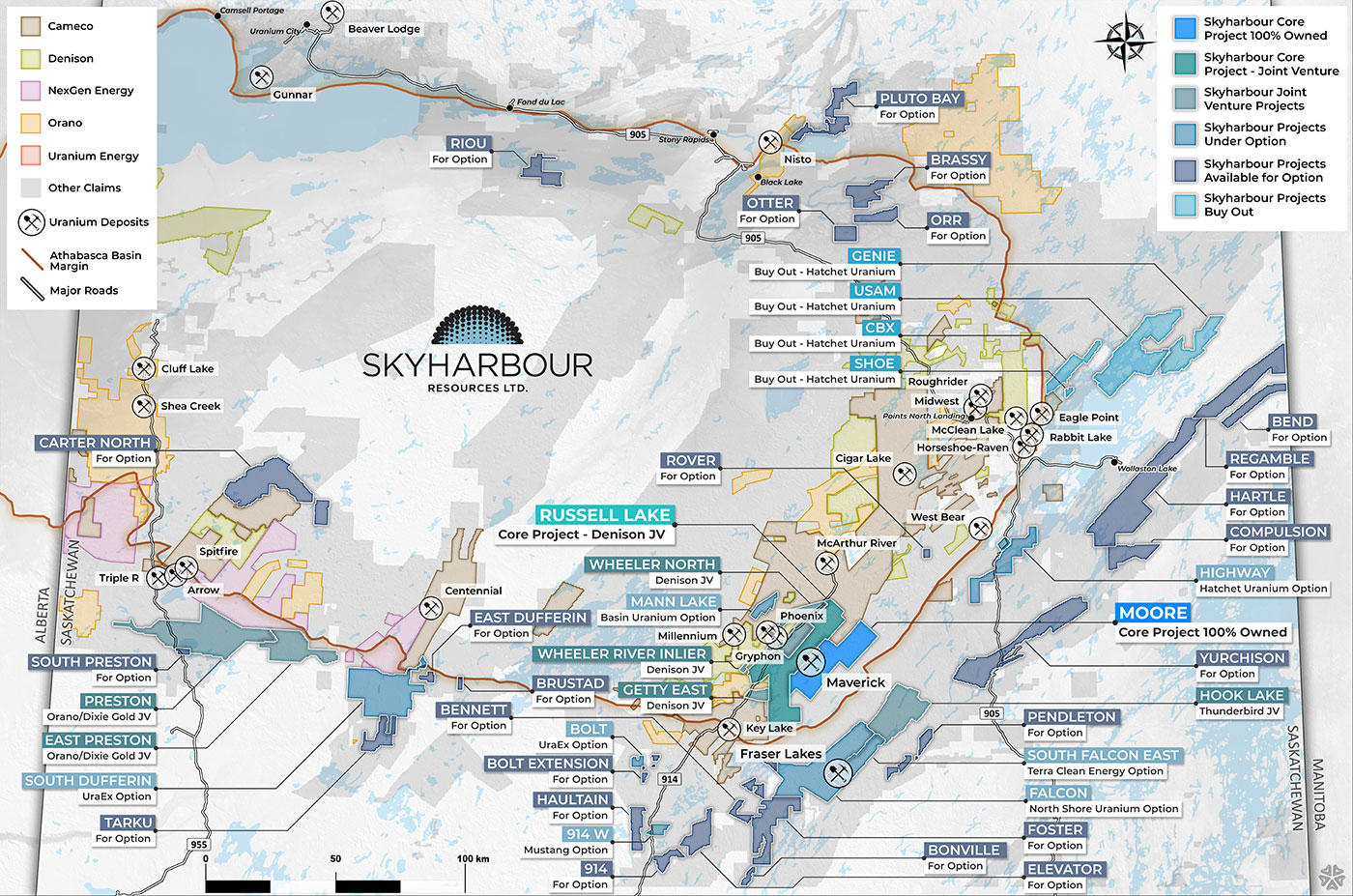 Skyharbour holds an extensive portfolio of uranium exploration projects in Canada's Athabasca Basin and is well positioned to benefit from improving uranium market fundamentals with interest in forty-three projects covering over 662,887 hectares (1,638,029 acres) of land. Skyharbour owns a 100% interest in the Moore Uranium Project, which is located 15 kilometres east of Denison's Wheeler River project and 39 kilometres south of Cameco's McArthur River uranium mine. Moore is an advanced-stage uranium exploration property with high-grade uranium mineralization at the Maverick Zone highlighted by drill results of up to 6.0% U3O8 over 5.9 metres, including 20.8% U3O8 over 1.5 metres at a vertical depth of 265 metres. Adjacent to Moore, Skyharbour is advancing several uranium properties within the Russell Lake project area with its joint venture partner and large strategic shareholder Denison Mines. Collectively these projects host multiple zones of uranium mineralization across a highly prospective land package with significant exploration upside, and the Company is actively working these assets through exploration and drilling programs.