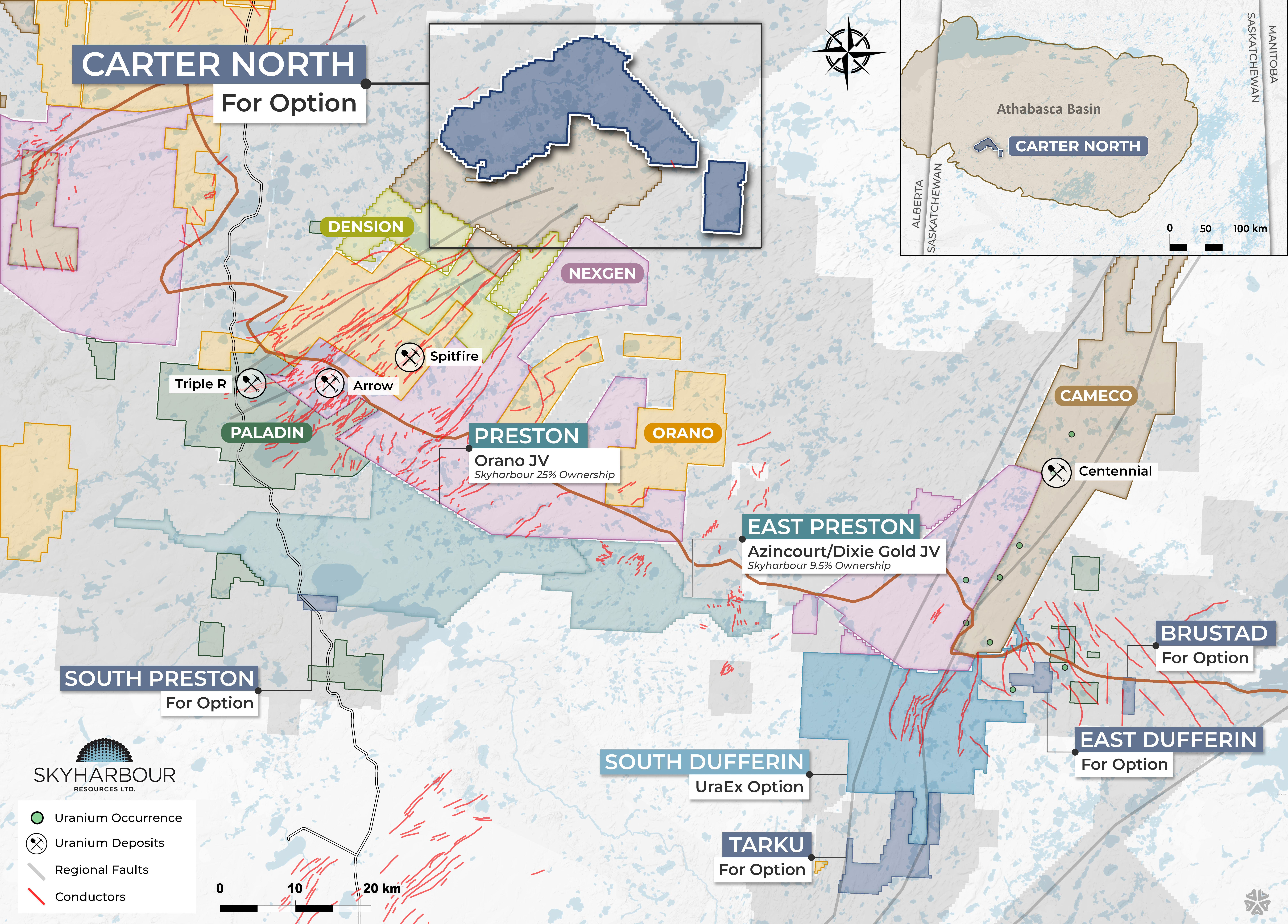 Skyharbour also has joint ventures with industry leader Orano Canada Inc., Azincourt Energy, and Thunderbird Resources at the Preston, East Preston, and Hook Lake Projects, respectively. The Company also has several active earn-in option partners, including CSE-listed Basin Uranium Corp. at the Mann Lake Uranium Project; TSX-V listed North Shore Uranium at the Falcon Project; UraEx Resources at the South Dufferin and Bolt Projects; Hatchet Uranium at the Highway Project; CSE-listed Mustang Energy at the 914W Project; and TSX-V listed Terra Clean Energy at the South Falcon East Project. In aggregate, Skyharbour has now signed earn-in option agreements with partners that total to potentially over $76 million in partner-funded exploration expenditures and over $42 million in cash and share payments coming into Skyharbour, assuming that these partner companies complete the earn-ins at their respective projects.