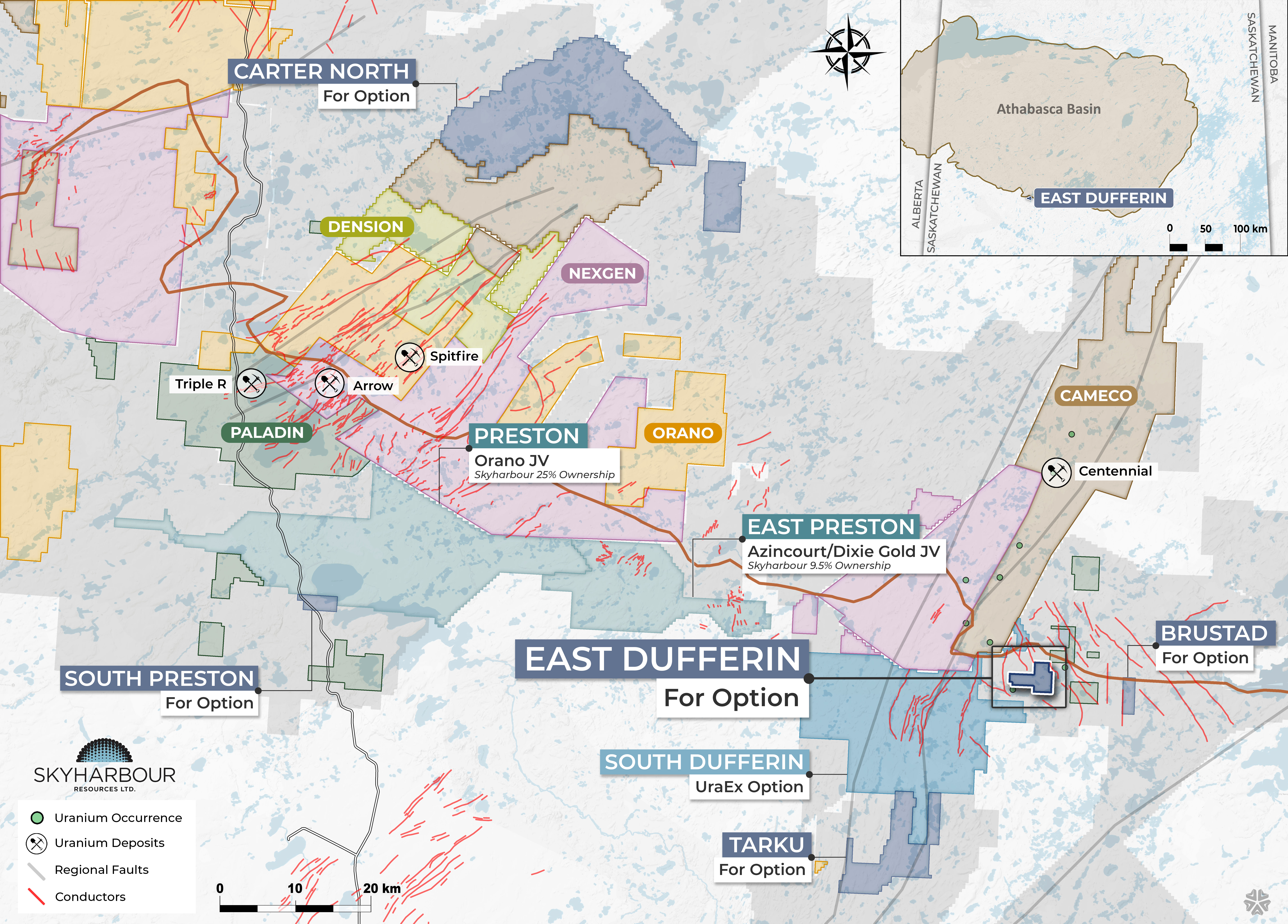 The South Dufferin Project has been expanded through the staking of one additional mineral claim totaling 49 hectares, increasing the project’s total land package to 39,398 hectares across 25 claims. The South Dufferin project is located immediately south of the Athabasca Basin in northern Saskatchewan and covers the southern extension of the Virgin River Shear Zone, which hosts known high-grade uranium mineralization at Cameco’s Dufferin Lake zone approximately 13 kilometres to the north and Cameco’s Centennial deposit approximately 25 kilometres to the north. In October of 2024, Skyharbour entered into an option agreement with a private company, UraEx Resources Inc., whereby UraEx may acquire up to a 100% interest in the Company’s South Dufferin Uranium Project.