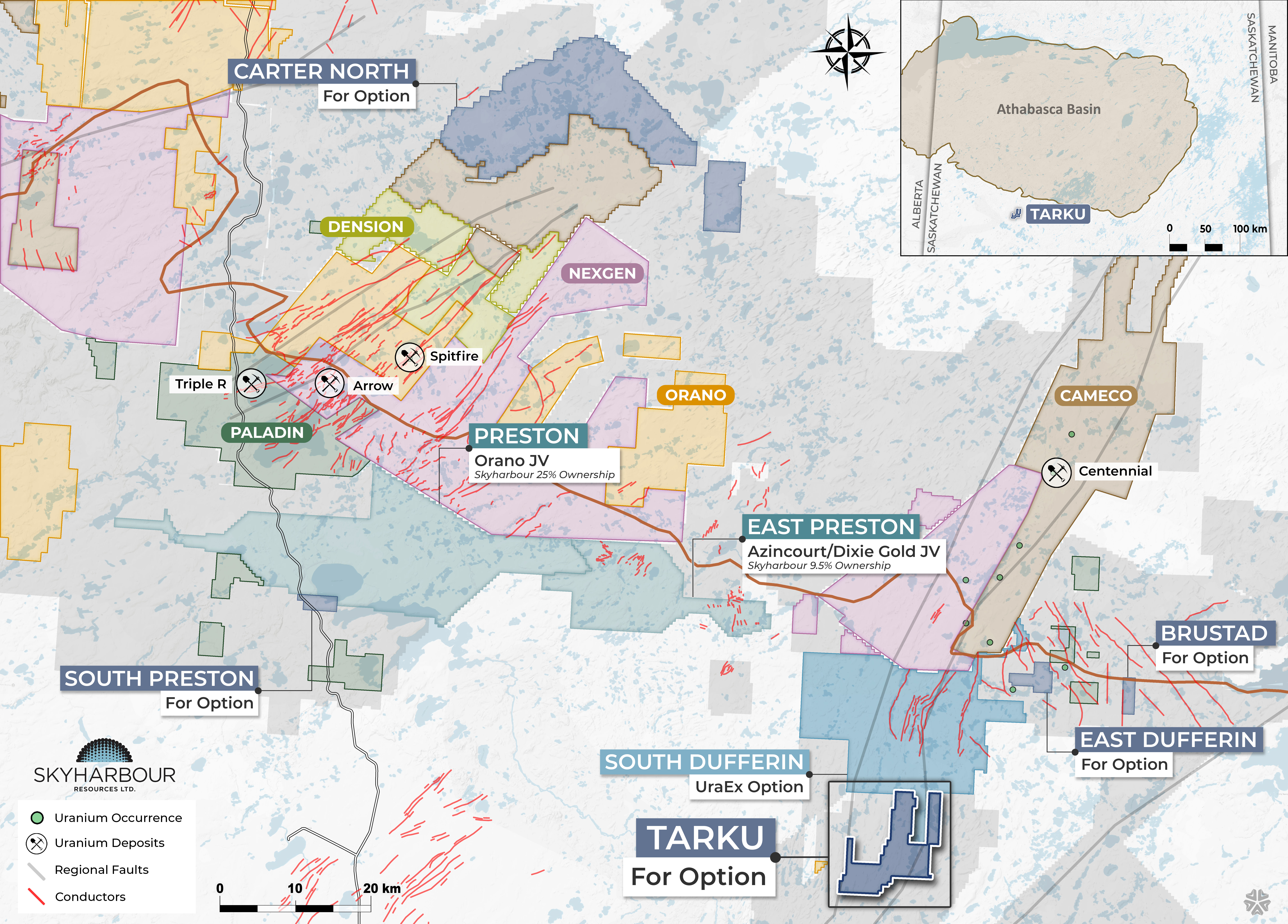 The Tarku Project consists of three claims, totalling 8,262 ha, including one newly staked claim covering 2,384 ha, and is located adjacent to Skyharbour’s South Dufferin Project, which is currently under option to UraEx Resources. The property covers the southern extension of the Virgin River Shear Zone, which hosts high-grade uranium mineralization at Cameco’s Dufferin Lake zone, approximately 32 kilometres to the north, with drill results of 1.73% U3O8 over 6.5 metres, and the Centennial deposit, approximately 47 kilometres to the north, which includes historical drill intersections of 8.78% U3O8 over 33.9 metres.