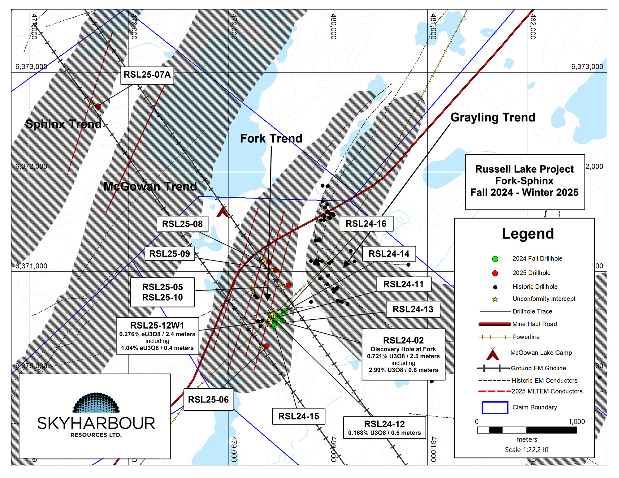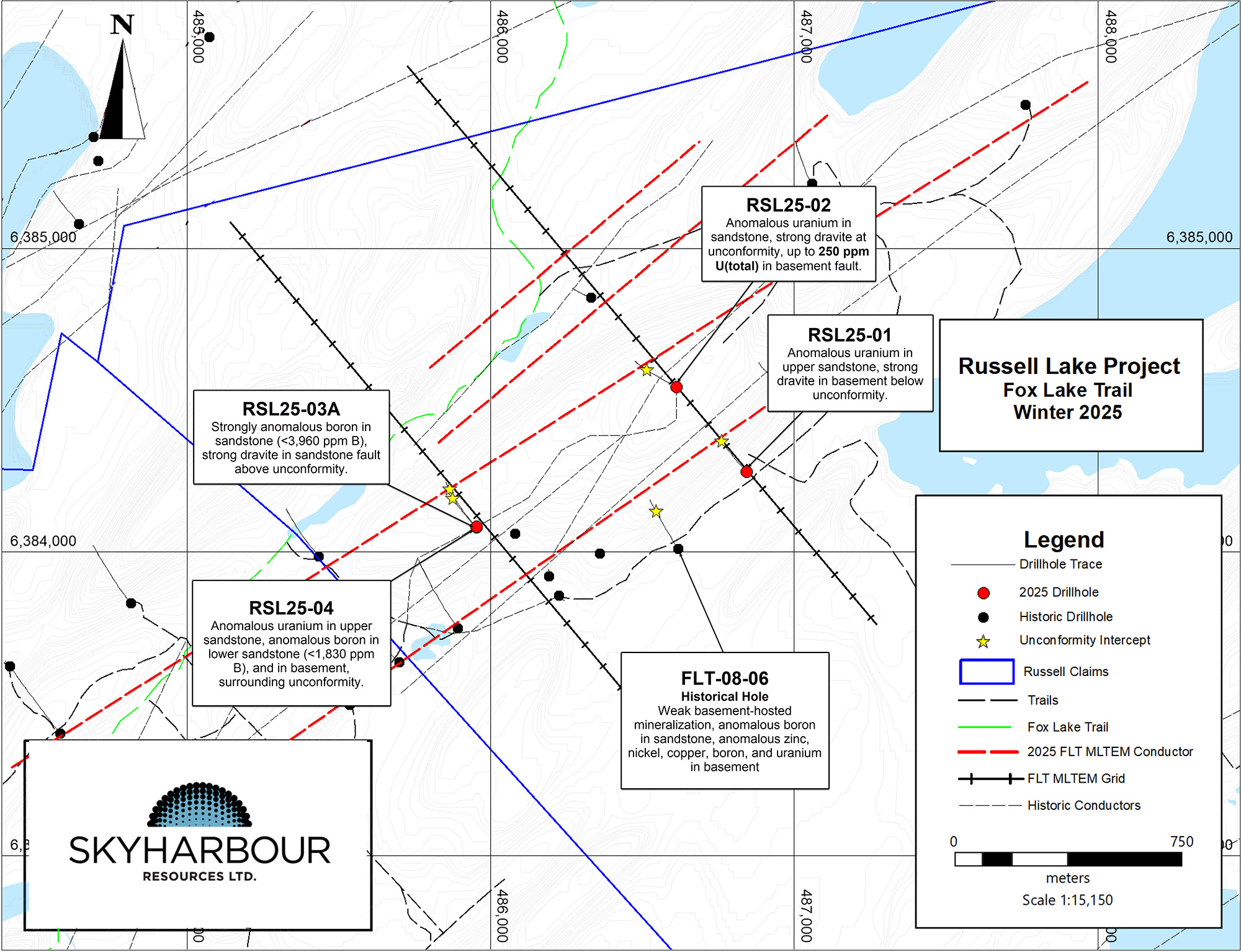 Furthermore, Skyharbour completed 4 drill holes at the Fox Lake Trail area, located at the northern end of the Russell Lake project area. The drilling tested two of the recently defined conductors by the 2025 ground EM survey within a broad conductive corridor that has seen limited historical drilling with sporadic uranium mineralization and favourable hydrothermal alteration.