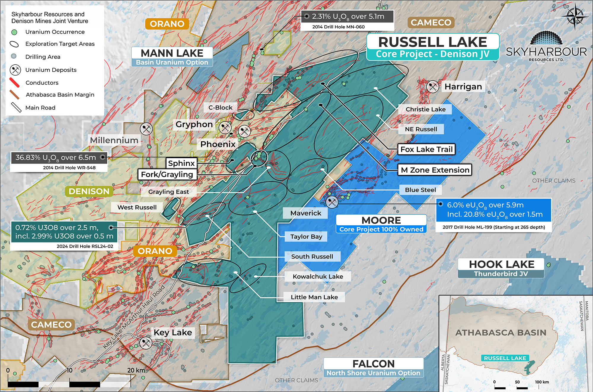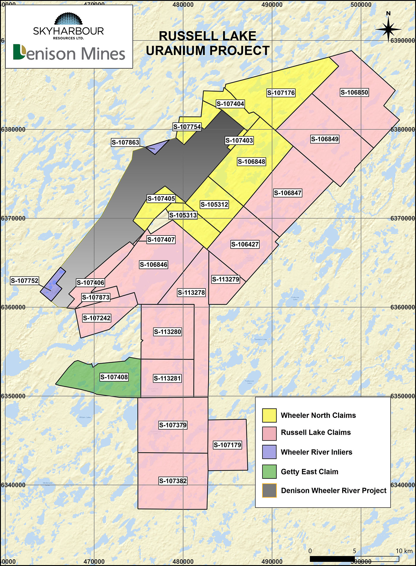 Jordan Trimble, President and CEO of Skyharbour, stated: “This is a transformative transaction for Skyharbour and our shareholders as it represents a major stamp of approval for Russell with up to $61.5 million in combined project consideration coming in. We are very pleased to expand upon our long-standing relationship with Denison and to partner with their team to advance one of the more prospective exploration projects in the Athabasca Basin proximal to existing and developing mines. Denison’s success in exploring, permitting, and developing the neighboring world-class Wheeler River Project will provide considerable insight and experience as we jointly pursue success at Russell. Further, this transaction delivers on our belief that Russell should be treated as multiple different projects due to the abundance of targets and sheer scale of the land package in one of the most prolific uranium exploration corridors in the world. The structure and terms of the Strategic Agreement allow Skyharbour to continue exploring as operator at the majority of the claims at Russell, while participating in the future success that Denison seeks as operator at the Wheeler North and Wheeler River Inlier claims. Furthermore, we will receive a significant amount of cash and Denison shares to help fund our exploration efforts and corporate activities through 2026.”