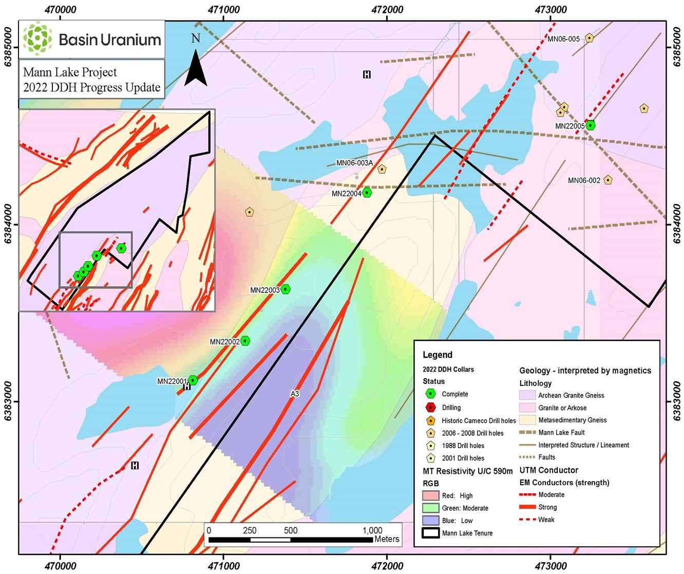 "Our phase one drill program successfully intersected uranium mineralization over one kilometre south of any previous historical drilling at Mann Lake. Our drilling was focused on testing the unconformity along significant conductors as neighbouring deposits in the area all occur along such conductors.” commented Basin Uranium’s CEO, Mike Blady. “Assay results from phase one drilling, all of which remain pending, in conjunction with the upcoming geophysical program will be used to define drill targets for our second phase this fall.”