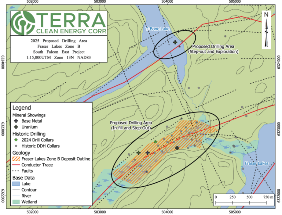 Terra is currently conducting a 2,000m - 2,200m helicopter supported drill program at the Property. Three diamond drill holes have been completed on the Fraser Lakes B Uranium Deposit, for a total of 802m, and a fourth hole is in progress.