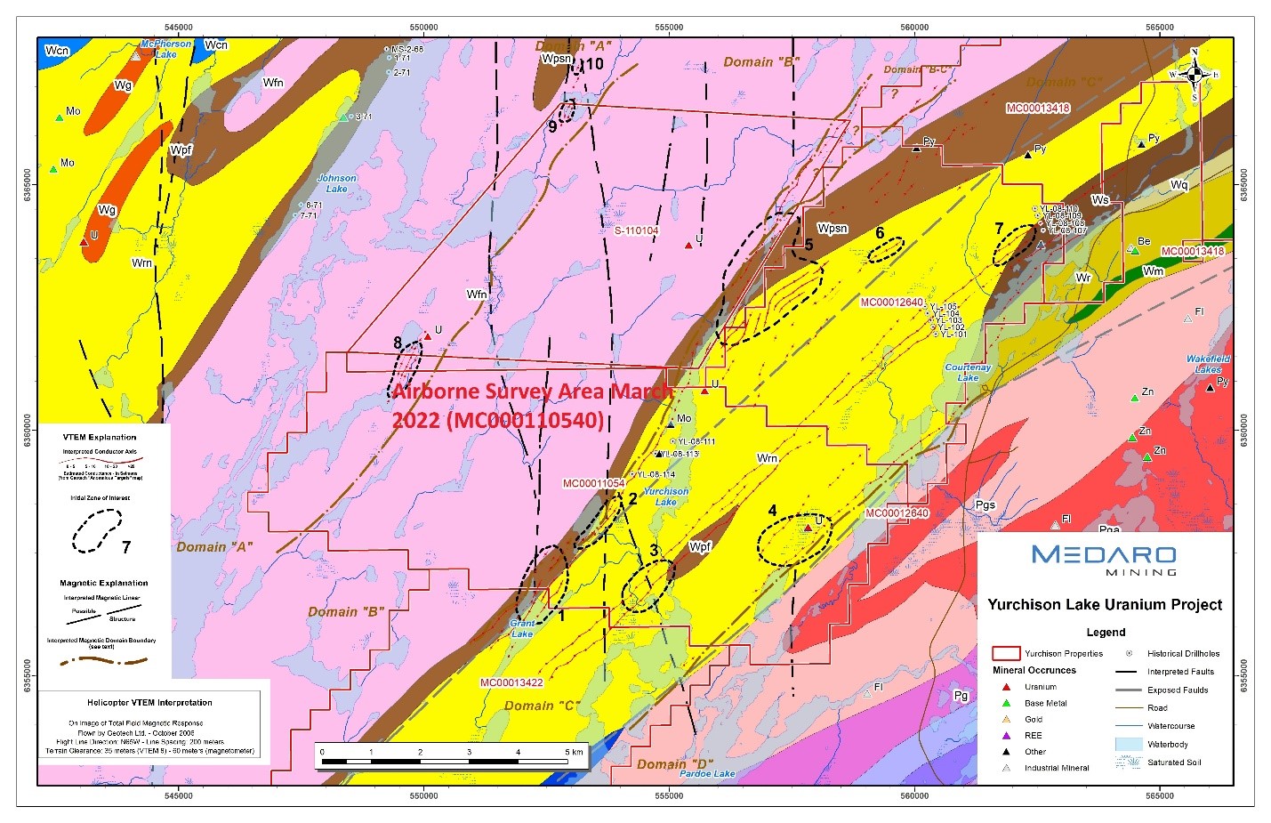 A Helicopter Versatile Time Domain ElectroMagnetic (VTEM) geophysics survey was flown by Geotech Ltd. on behalf of JNR Resources on the Yurchison Property in October 2006 and identified ten Zones of Interest-based on the electromagnetic (EM) conductors and the total field magnetic response (Figure 1) (assessment report 74H08-0041). Zones of Interest are areas with the potential to host uranium mineralization based on their geophysical signature. This historic survey was flown at 200 metres line spacing, so Medaro decided to fly the current survey at 50 metres line spacing to obtain more detailed resolution on the anomalies. The EM conductors, shown as red dotted lines in Figure 1, are along an SW-NE trend parallel to the rock unit boundaries and a major fault (Needle Falls Shear Zone). The magnetic geophysics survey will provide structural information, especially the location of the N-S trending Tabbernor faults (black dashed lines in Figure 1). The intersection of the major fault and the Tabbernor faults and the graphitic metasedimentary rocks are exploration targets for uranium mineralization. The Zones of Interest also correspond to the contact between two different rock units (Figure 1).