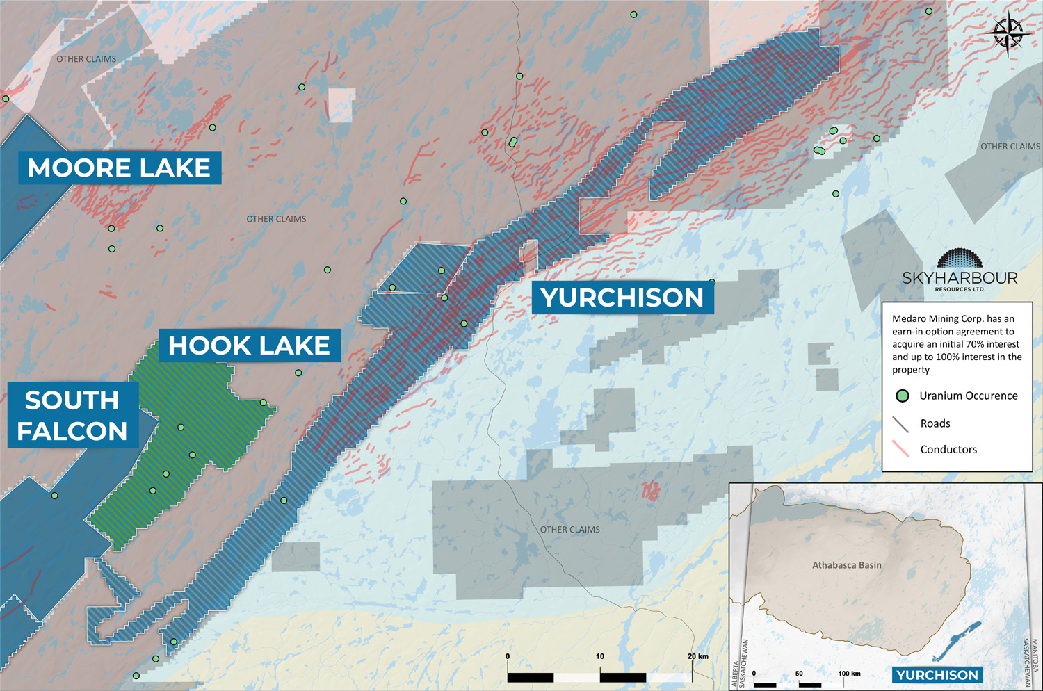 Skyharbour has several active option partners including: ASX-listed Valor Resources on the Hook Lake Uranium Project whereby Valor can earn-in 80% of the project through CAD $3,500,000 in exploration expenditures, $475,000 in cash payments over three years and an initial share issuance; CSE-listed Basin Uranium Corp. on the Mann Lake Uranium Project whereby Basin Uranium can earn-in 75% of the project through $4,000,000 in exploration expenditures, $850,000 in cash payments as well as share issuances over three years; and CSE-listed Medaro Mining Corp. on the Yurchison Project whereby Medaro can earn-in an initial 70% of the project through $5,000,000 in exploration expenditures, $800,000 in cash payments as well as share issuances over three years followed by the option to acquire the remaining 30% of the project through a payment of $7,500,000 in cash and $7,500,000 worth of shares.