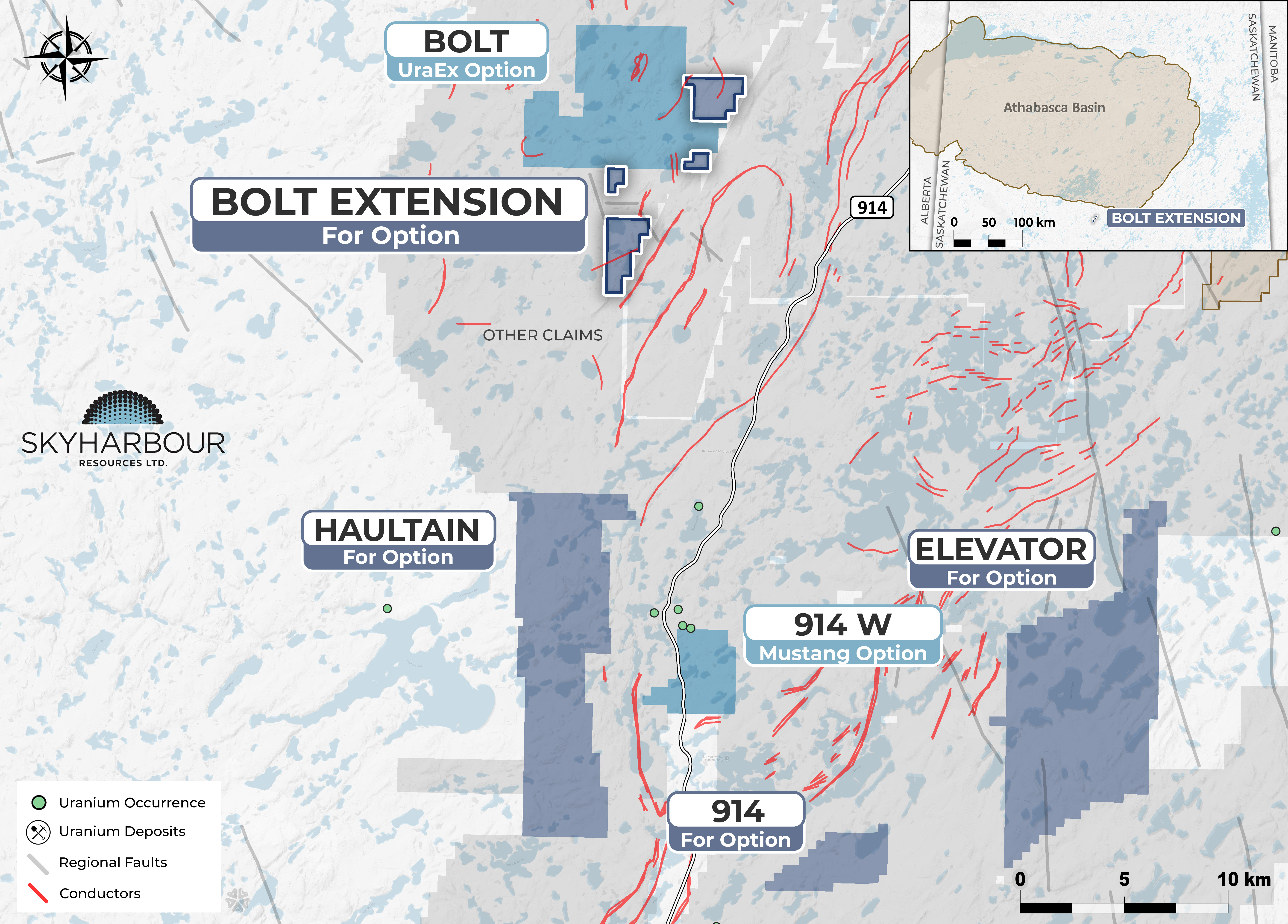 The Bolt Extension Project comprises four newly staked claims adjacent to Skyharbour’s Bolt Project, currently under option to UraEx Resources. Mapping conducted in the 1970s and 1980s shows a north-south-trending, anastomosing package of amphibole gneisses surrounded by felsic gneisses, metamorphosed to granulite or upper amphibolite grade. Given the age and scale of the historical geological mapping, the area’s structural and lithological complexity is likely underestimated. Past work includes airborne and ground geophysics, as well as lake sediment and water sampling. Recent exploration between 2008 and 2018 identified multiple EM conductors, magnetic lows, and faults that extend onto the Bolt Extension claims. These features highlight the property’s strong potential to host basement-hosted unconformity-related uranium mineralization, as well as pegmatite-hosted U-Th-REE mineralization.