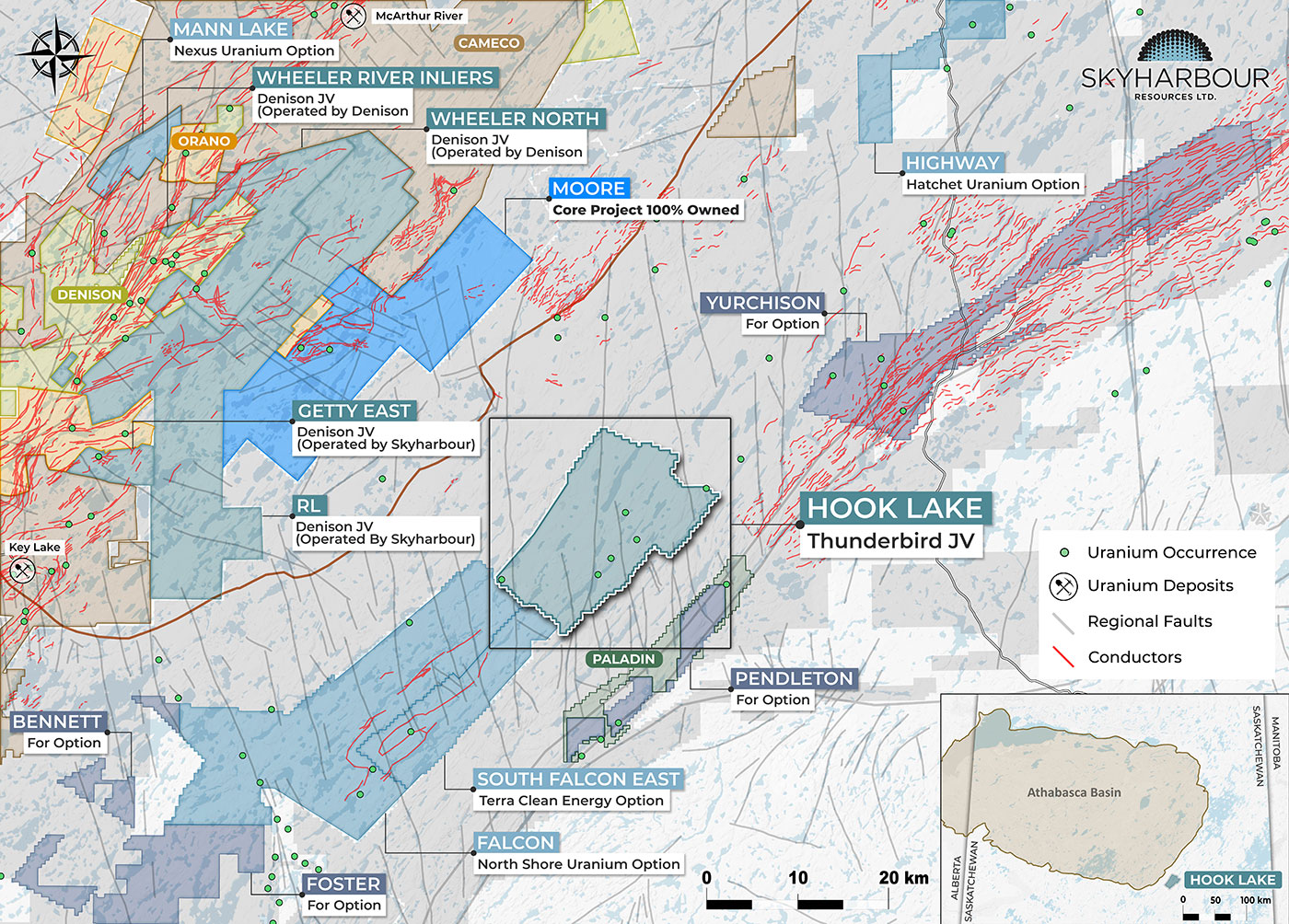 - Thunderbird Resources (previously Valor) recently completed an earn-in of 80% interest in the Hook Lake Uranium Project through exploration expenditures as well as cash and share payments to Skyharbour; the Company retains a 20% interest in the Project