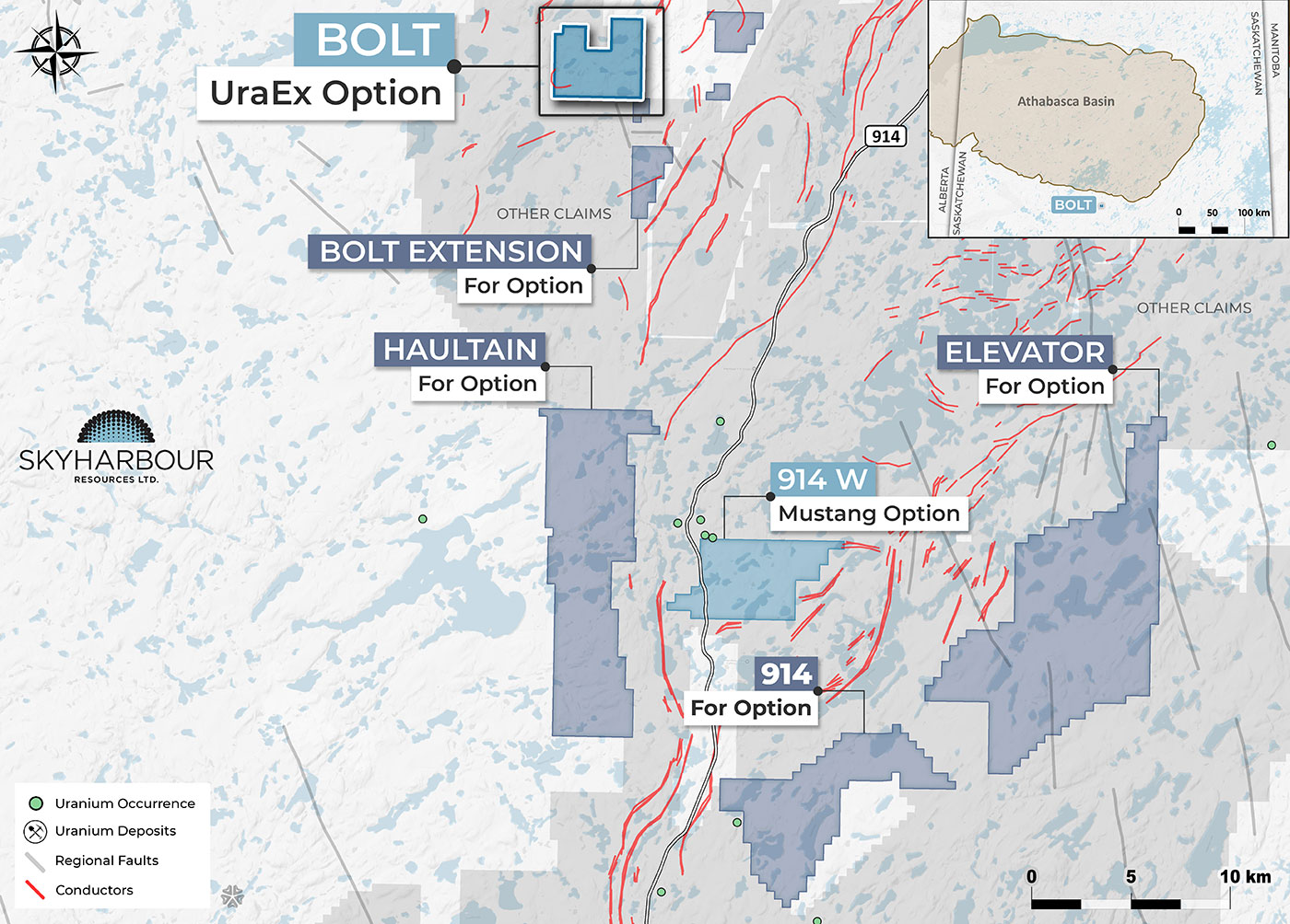 The Bolt Project consists of two contiguous claims 100% owned by Skyharbour Resources Ltd. totalling 4,726 hectares and is located approximately 7 km west of the Highway 914 and about 32 km southwest of Cameco’s Key Lake Operation (which produced 209.8 million pounds of U3O8 at an average grade of 2.32% U3O8 from 2 deposits, where ore from the McArthur River mine is currently processed). A Definitive Agreement was recently signed in October of 2024 with UraEx Resources to earn an initial 51% and up to 100% of both the South Dufferin and Bolt Projects, collectively.