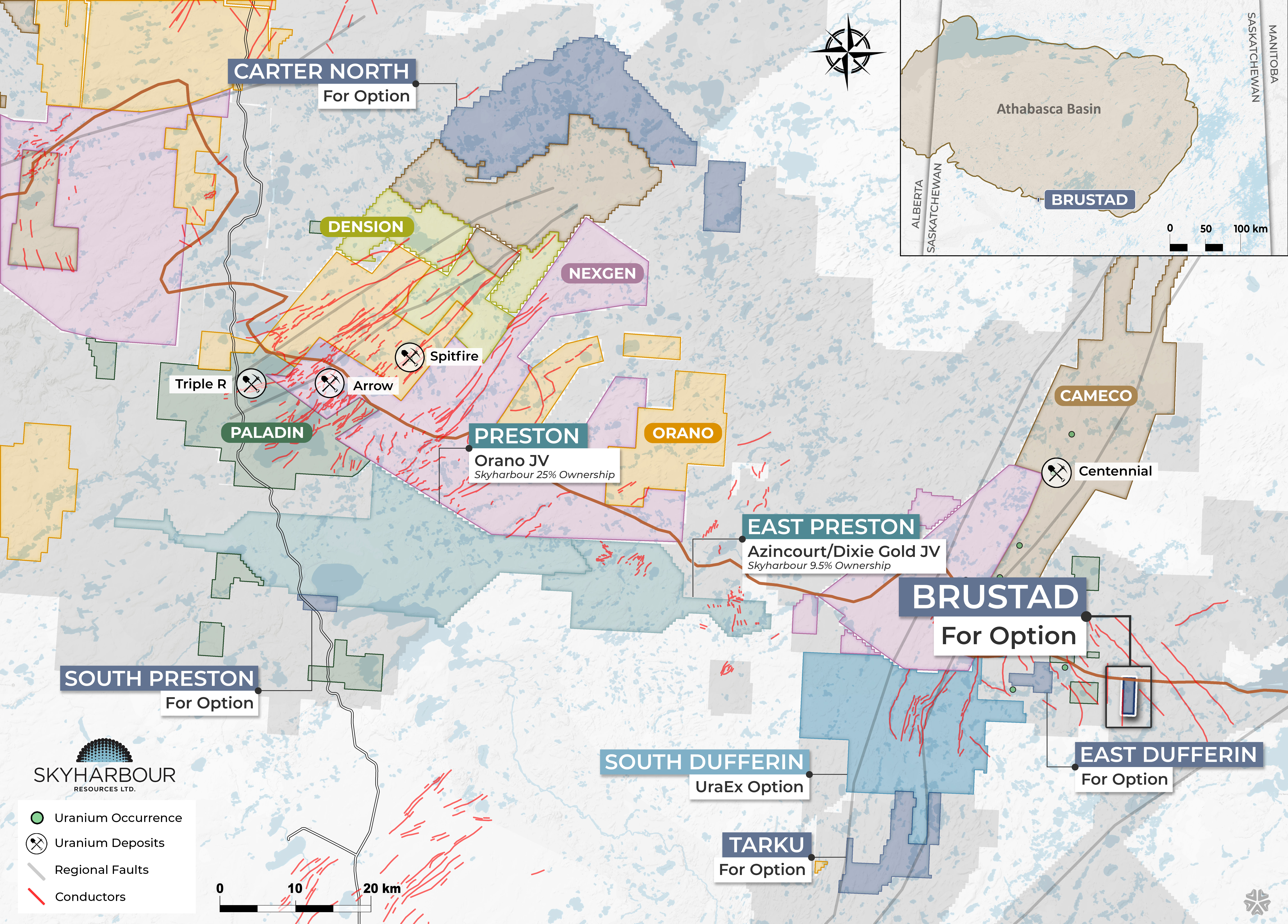 The Brustad project consists of one newly staked mineral claim totaling 791 hectares, located approximately 21 km east of Skyharbour’s South Dufferin property. The property is located just south of the southern Athabasca Basin margin in the Mudjatik Domain of northern Saskatchewan, with the basement rocks underlying the property including Archean granitoid gneisses and subordinate Paleoproterozoic metasedimentary gneisses.
