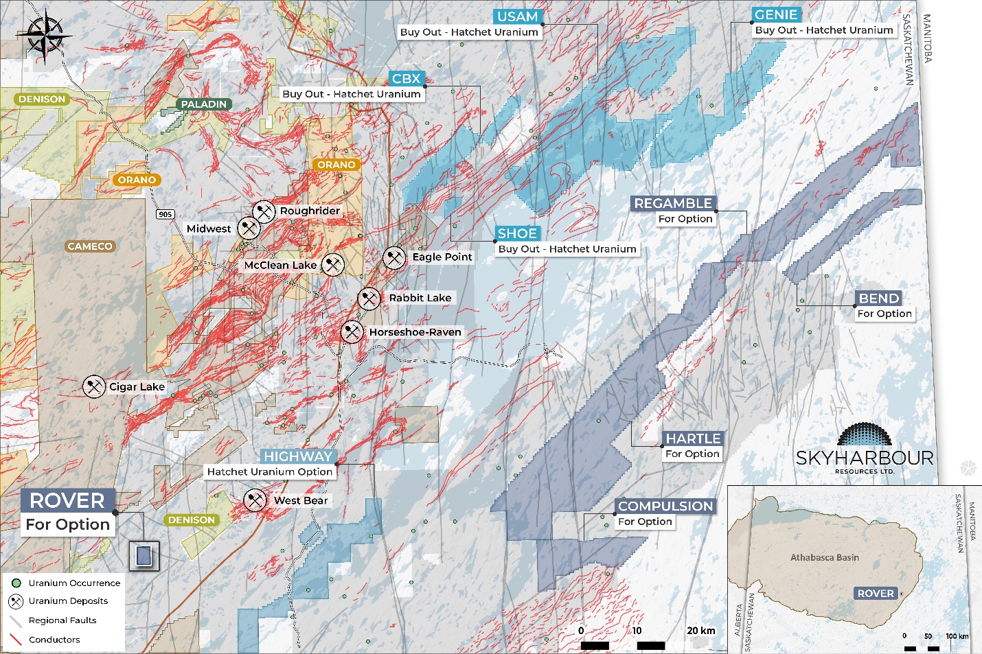 The newly staked Rover Project consists of a single claim totalling approximately 792 hectares located approximately 40 kilometres east of Cameco’s McArthur River Mine, 31 kilometers southeast of Cigar Lake Mine, and 68 kilometers west of the community of Wollaston Lake. Historical exploration extended over a long-time span, from the late 1960s through the early 1990s, with most of the work being completed in the 1970s. The property is located within the Athabasca Basin and is underlain by a shallow cover of Athabasca Group Sandstones, which in turn overly the Paleoproterozoic metasedimentary rocks of the Wollaston Supergroup.