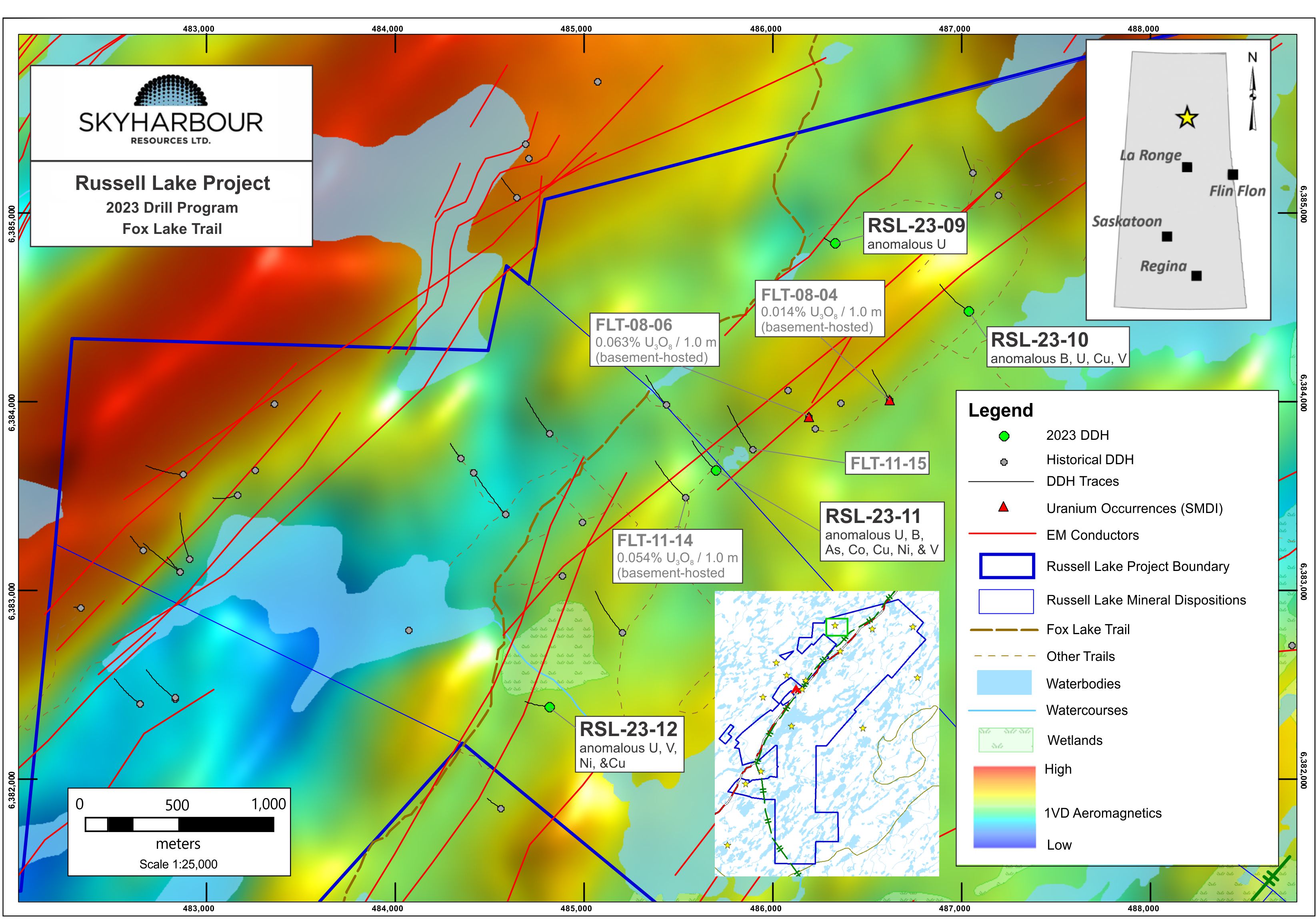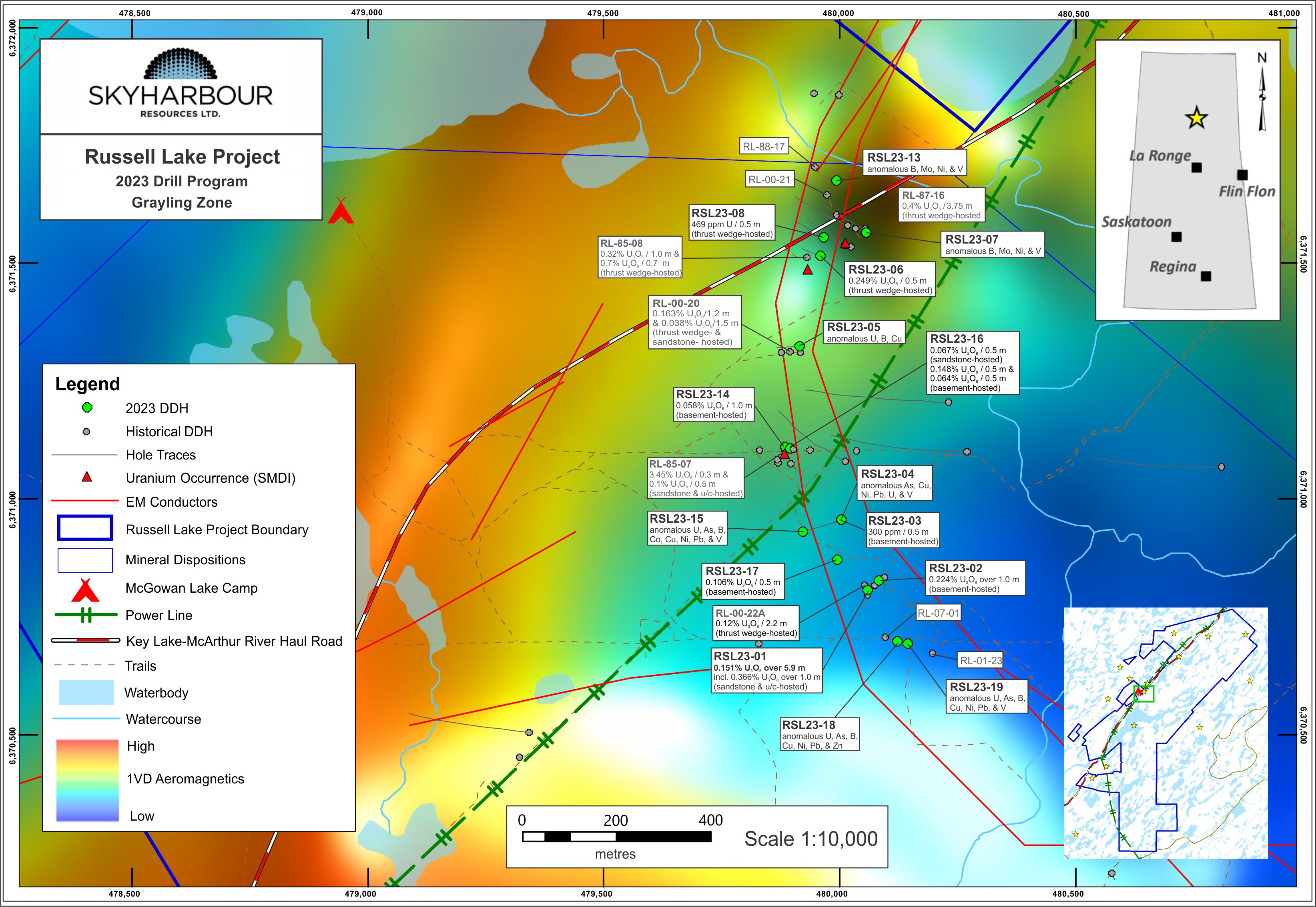 Vancouver, BC - Skyharbour Resources Ltd. (TSX-V: SYH) (OTCQX: SYHBF) (Frankfurt: SC1P) (the “Company”) is pleased to announce results for its inaugural drilling program at its recently optioned 73,294 hectare Russell Lake Uranium Project, strategically located in the central core of the Eastern Athabasca Basin of northern Saskatchewan. Three phases of drilling were completed on the property this year with eight holes totalling 3,661.5 metres drilled at the Grayling Zone in Phase One, followed by Phase Two consisting of 2,730 metres in four holes at the Fox Trail target area, and returning to the Grayling Zone for Phase Three where an additional 3,203 metres was drilled in seven holes. Uranium mineralization was intersected in the majority of holes at the Grayling Zone over a strike length exceeding one kilometre. Drill hole RSL23-01 intersected one of the best ever drill results from the project, returning a 5.9 metre wide intercept of 0.151% U3O8 at a depth of 338.4 metres, which includes 1.0 metres of 0.366% U3O8 at 343.3 metres depth within a thrust wedge.