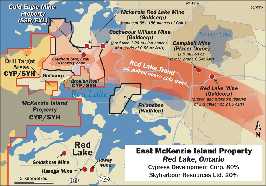 The Broulan Reef property is located in the Bruce Channel area in the heart of the Red Lake gold mining district. The acreage is comprised of 10 mineral claims (21 year renewable Leases with the Ontario Government), situated adjacent to the Exall Resources / Southern Star Resources major diamond drill program now underway on their Gold Eagle mine property to the north, and to the west of Wolfden Resources promising drill results on their Folansbee property. Both of these properties are the subject of ongoing exploration and delineation drilling.