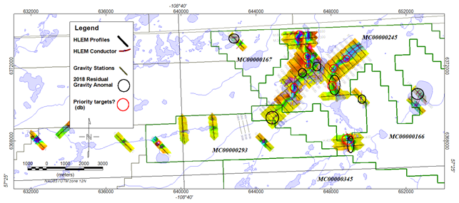Ground-truthing work confirmed the airborne conductive trends and more accurately located the conductor axes for future drill testing. The gravity survey identified areas along the conductors with a gravity low signature, which is often associated with alteration, fault/structural disruption and potentially, uranium mineralization. The combination/stacking of positive features has assisted in prioritizing targets.