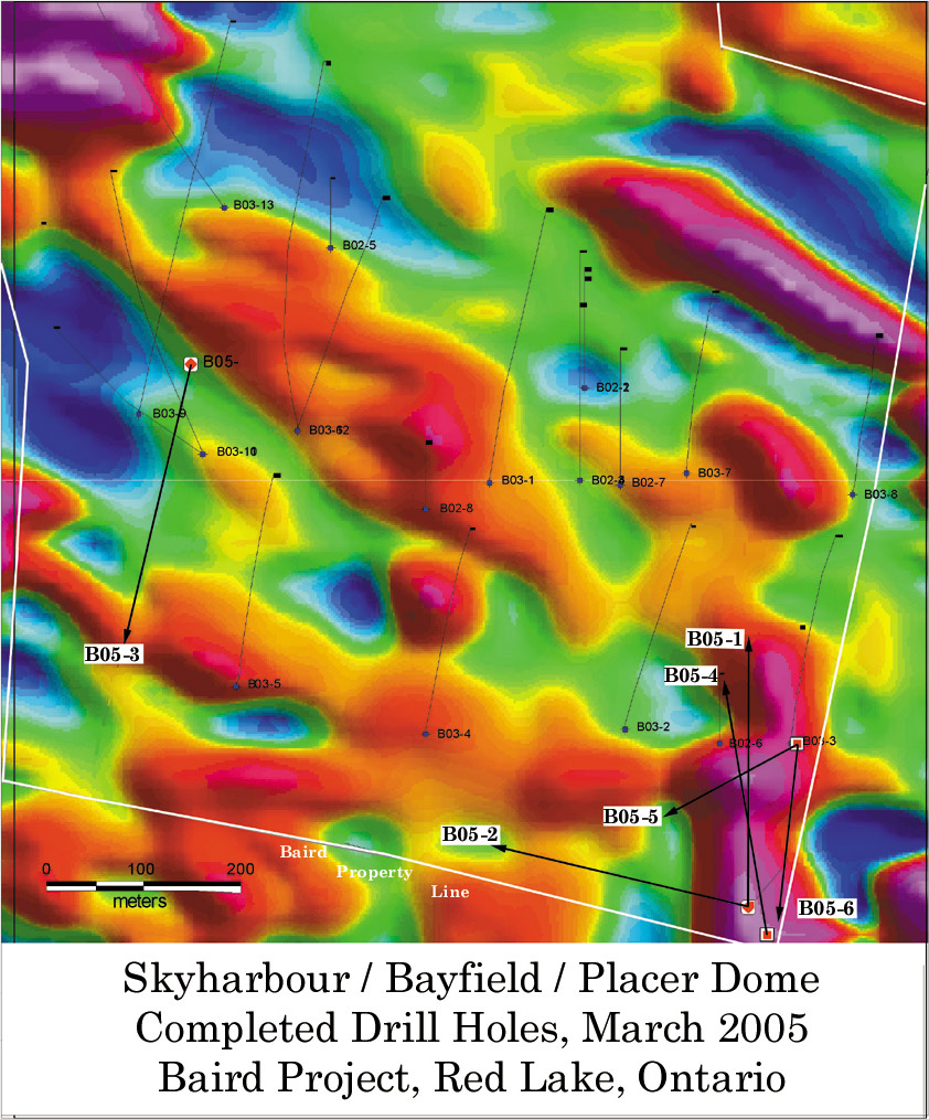 Skyharbour Resources Ltd. (Skyharbour) has now completed the winter 2005 diamond drill program on its Baird gold property, located in the heart of the Red Lake gold district, Northwestern Ontario. The property was jointly held by Skyharbour as operator (50%) and Bayfield Ventures Corp. (50%). The Baird property has been under option to Placer Dome (CLA) Ltd., with Placer having to spend $800,000 by May 2005, to earn a 51% interest. Placer Dome (CLA) Ltd. has now earned its interest and will become operator of the Baird property with Skyharbour and Bayfield Ventures each holding a 24.5% interest.