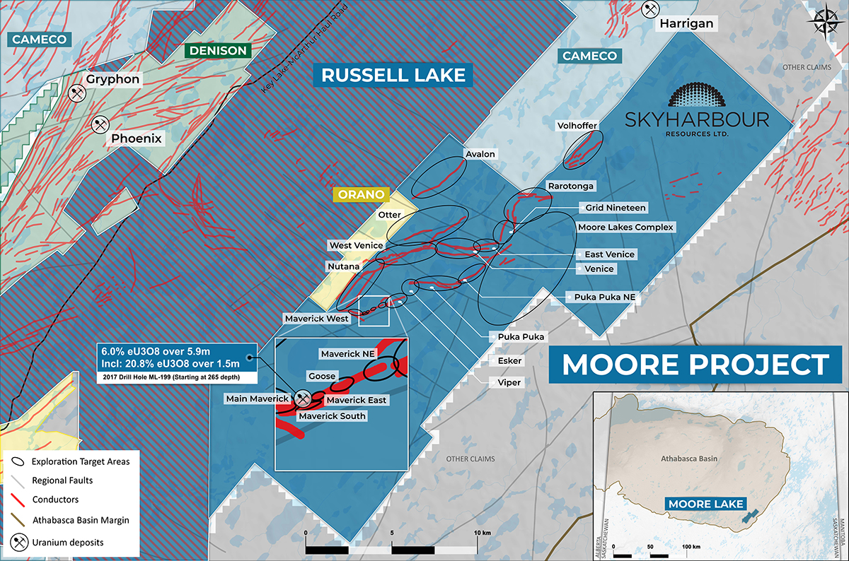 Jordan Trimble, President and CEO of Skyharbour Resources, stated: “The drill results announced here demonstrate the high-grade, shallow endowment of uranium mineralization at the Main Maverick Zone. We continue to expand this main zone, and will be drilling this summer to further delineate the numerous high-grade zones of uranium on the Maverick Corridor taking advantage of regional infrastructure including the exploration camp at our adjacent Russell Lake project to bring our costs down. The multi-kilometre Maverick Corridor offers strong discovery potential along strike and at depth in the underlying basement rocks, and we also plan to test prospective regional targets that have had limited drill-testing historically. With the recent discovery of high-grade uranium mineralization at Russell in the Fork Zone, this has been an exciting season of drilling thus far for Skyharbour with much more news to come at both Moore and Russell as well as at the various partner-funded projects.”