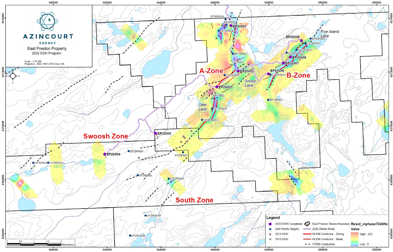 Based on the recent drilling results and the similar geological and structural setting to the prolific Patterson Lake trend, detailed follow-up drilling is recommended for the existing A- and B- zones, along with step-out drilling to the northeast and south along the B-zone trend, to the South zone along the SW strike extension of the A-zone. The additional target areas that have yet to be drill tested are also recommended for target refinement and future drill testing (Figure 2 – East Preston Project Target Area Location Map with VTEM Interpretation, below).