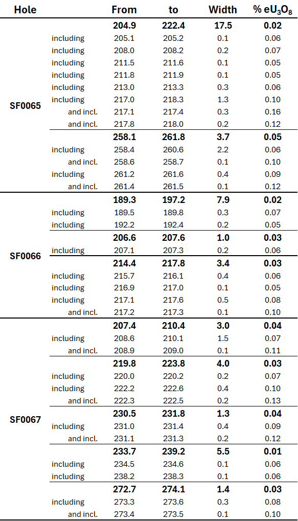 Hole SF0067 was drilled to a depth of 302m, to extend the mineralized pegmatite package to the north and confirm the interpreted north dipping orientation of the clay alteration. Drilling intersected a 70m interval containing multiple mineralized granitic pegmatites and zones within the altered and graphitic pelitic gneiss package. This interval is noted for the larger number of higher-grade spikes at or above 0.1% eU3O8 intersected compared to the previous drilling in this program. Down-hole gamma logging returned equivalent grades of 0.03% eU3O8 over 4.0m from 219.8m to 223.8m, including 0.13% eU3O8 over 0.2m and 0.01% eU3O8 over 5.5m from 233.7m to 239.2m, including 0.06% eU3O8 over 0.2m in the two widest intervals. The zone of strong clay alteration and bleaching was intersected from 66.5m to 73.5m. Drilling has now extended the deposit to the north and northeast and is still open in this direction. It is interpreted that the clay altered structural zone identified in SF0063, SF0065, SF0066 and SF067 is dipping to the north and will intersect the mineralized and hematite altered graphitic pelitic gneiss and pegmatites approximately 120m to 150m north of the current drilling. A follow-up drill program is currently being planned to test this upgraded target area for a higher-grade unconformity related basement-hosted uranium deposit and additional mineralized pegmatites where these structures and alteration all intersect.