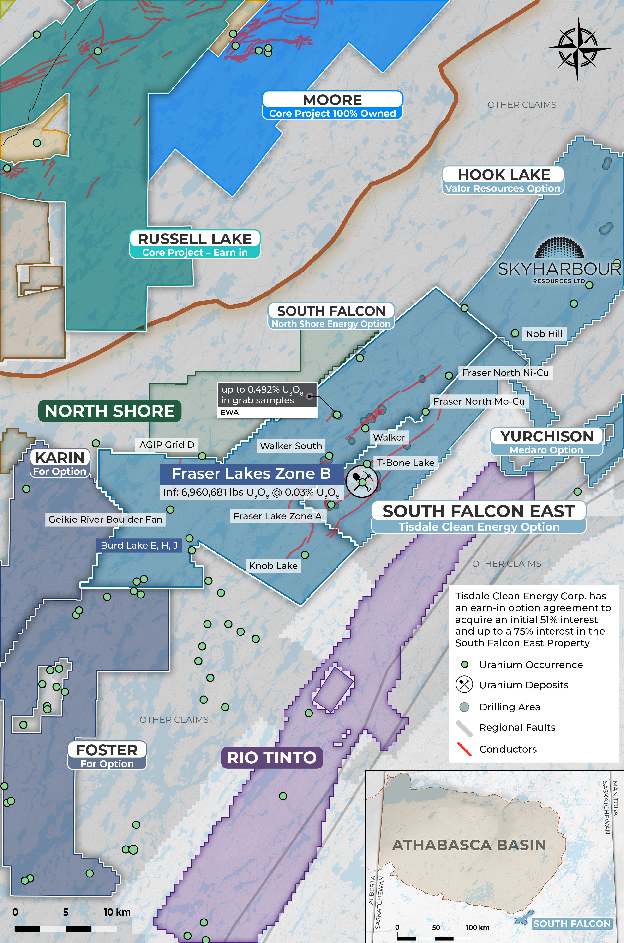 Vancouver, BC - Skyharbour Resources Ltd. (TSX-V: SYH) (OTCQX: SYHBF) (Frankfurt: SC1P) (“Skyharbour” or the “Company”) is pleased to announce plans for partner company Tisdale Clean Energy Corp.’s (“Tisdale”) upcoming work program at the South Falcon East Uranium Project which hosts the Fraser Lakes B uranium deposit. The South Falcon East Project lies 18 km outside the edge of the Athabasca Basin, approximately 50 km east of the Key Lake uranium mill and former mine. Tisdale entered into an option agreement with Skyharbour that was finalized last year (see news release dated January 25th, 2023) whereby Tisdale can earn up to a 75% interest in the South Falcon East project. Under the Option Agreement and assuming the 75% interest is earned, Tisdale will have issued Skyharbour 1,111,111 Tisdale shares upfront, and will fund exploration expenditures totaling CAD $10,500,000, as well as pay Skyharbour CAD $11,100,000 in cash of which $6,500,000 can be settled for shares in the capital of Tisdale (“Shares”) over the five-year earn-in period.