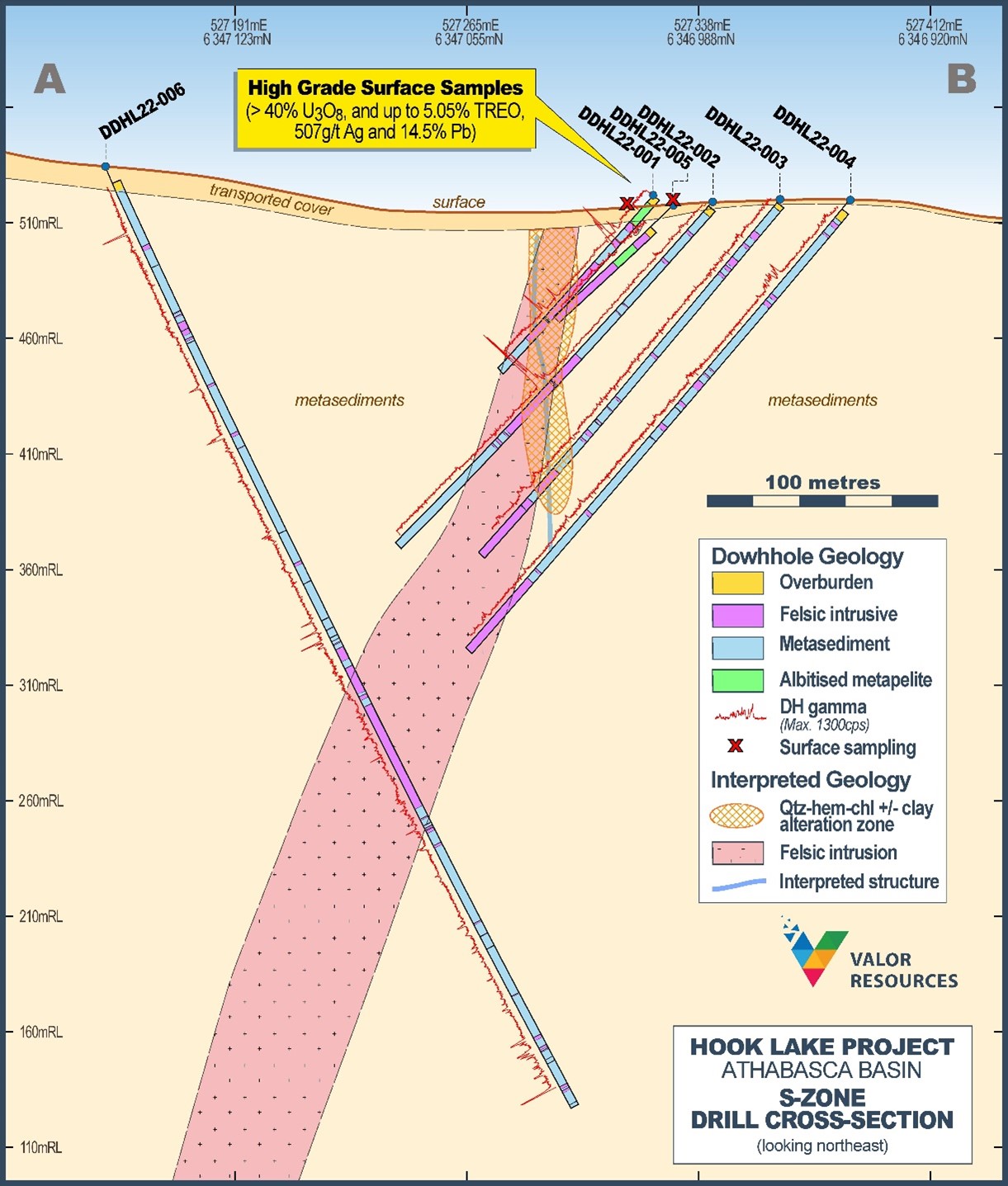 Three of the drillholes at S-Zone encountered elevated radioactivity and associated alteration of varying widths. Drill hole DDHL22-002 intersected a zone from 104.3m to 108.0m downhole depth of elevated radioactivity and alteration, with traces of uraninite mineralization noted in some of the fractures. This zone can be correlated between three holes on the drill section and potentially represents a sub-vertical structure. The two drill holes (DDHL22-001 and 005) drilled closest to the Hook Lake trench, where surface sampling conducted by Valor returned previously reported assays of up to 59.2% U3O8, intersected a zone of albitite alteration and elevated radioactivity in hole DDHL-005.