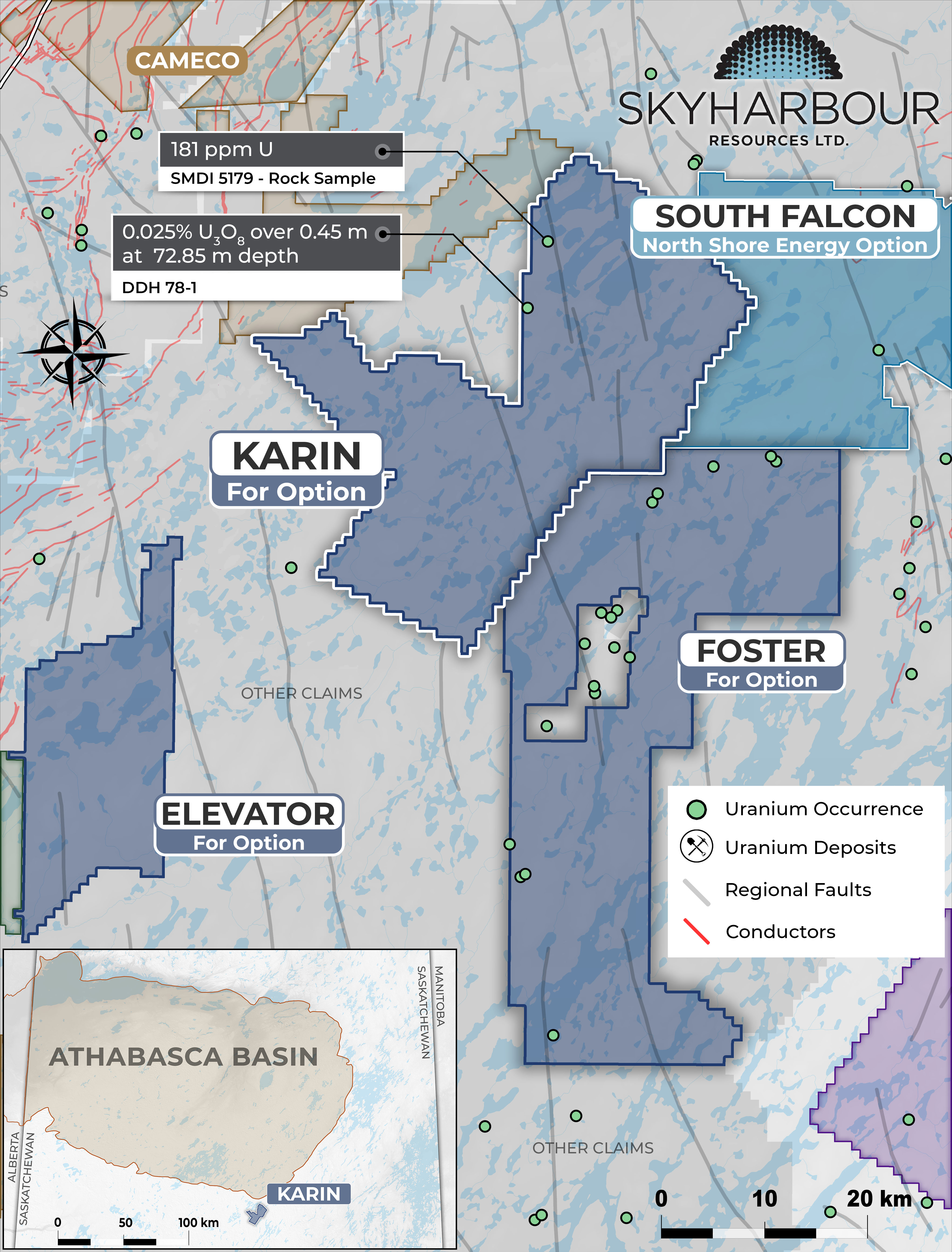 Vancouver, BC - Skyharbour Resources Ltd. (TSX-V: SYH) (OTCQX: SYHBF) (Frankfurt: SC1P) (“Skyharbour” or the “Company”), is pleased to announce that it has entered into a property purchase and sale agreement (the “Agreement”) with Cosa Resources Corp. (“Cosa”) dated July 26th, 2024, whereby Skyharbour will sell Cosa two (2) mineral claims, comprising approximately 6,049 hectares. These two claims represent a small portion of Skyharbour’s Karin Property and are located in Saskatchewan about 22 km south of the Key Lake Mill. In consideration for the claims, Cosa will issue to Skyharbour 250,000 common shares in the capital of Cosa (the “Consideration Shares”). Skyharbour originally acquired the claims through low-cost, online staking. The Company retains ownership in five other adjacent claims constituting the new Karin Project which is now 19,116 hectares.
