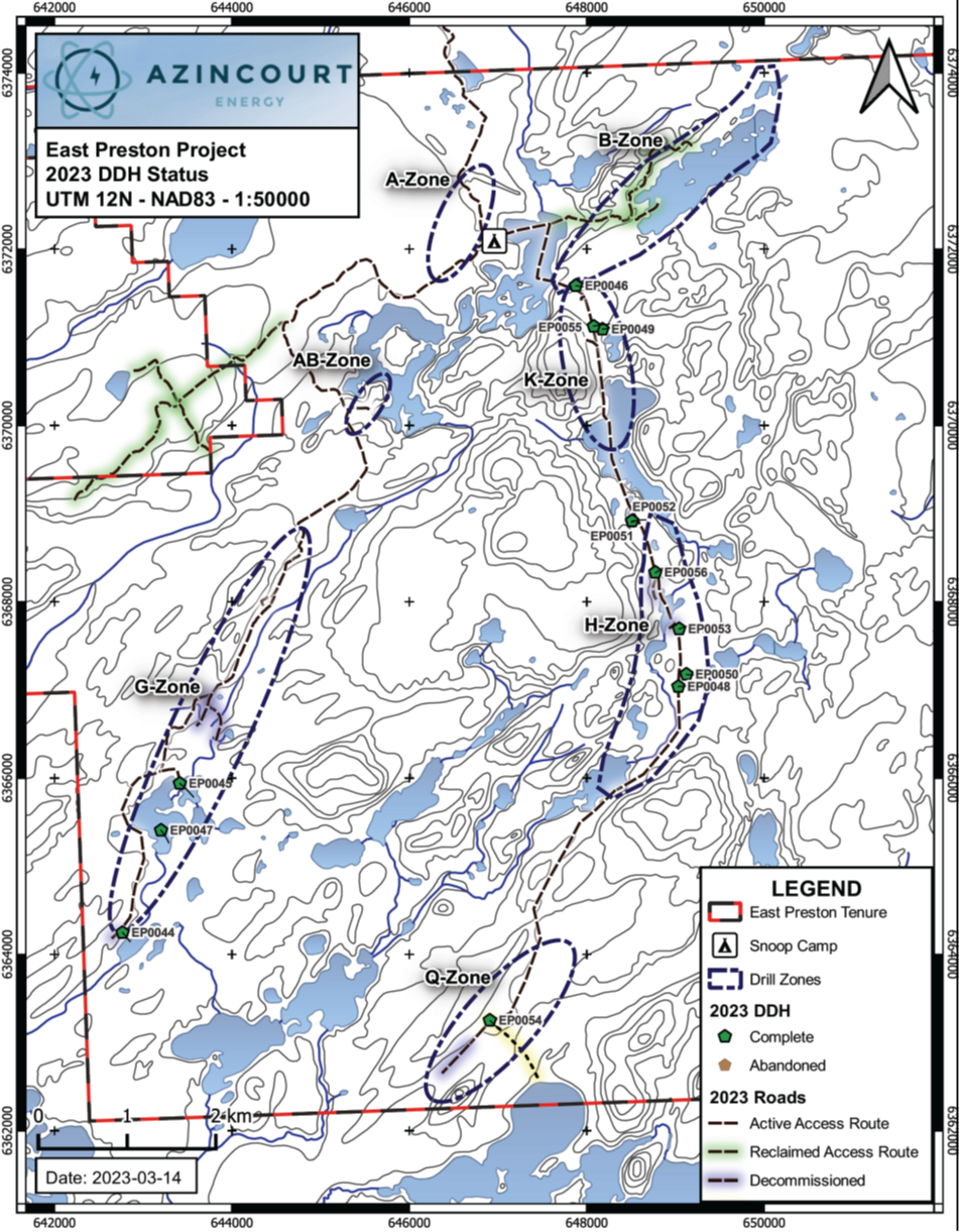 Azincourt is undertaking a drill program for the winter of 2024, consisting of up to 1,500 meters of drilling in a maximum of five (5) diamond drill holes. The priority will be to follow up on the clay alteration zone with elevated uranium that was identified in the winter of 2023 with a focus on the area of transition between the K and H Zones.