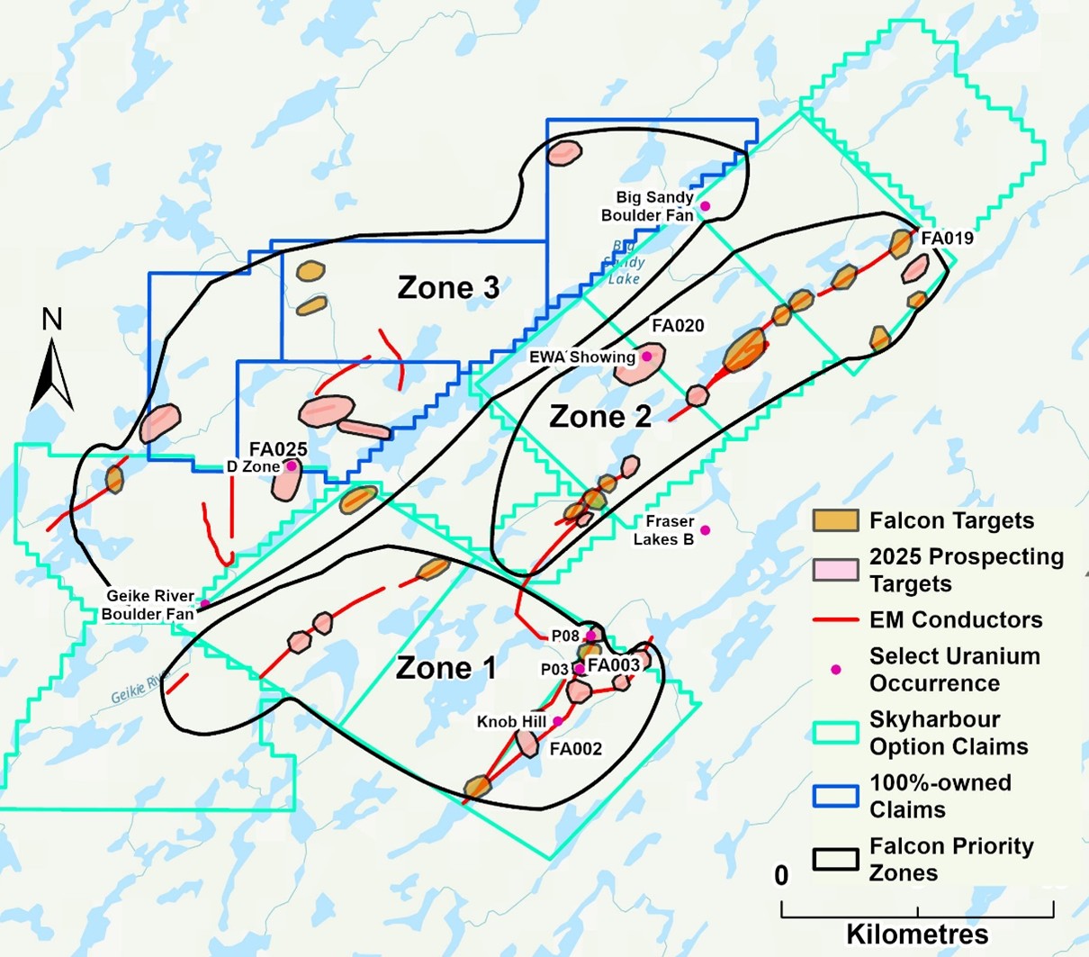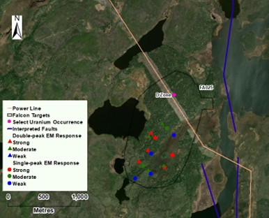 Three priority areas have been established at Falcon, Zones 1, 2 and 3. Within these three areas, 36 uranium targets have been identified (Figure 1). The targets are associated with EM conductor anomalies and have been selected based on the analysis and interpretation of multiple geophysical and geologic datasets.