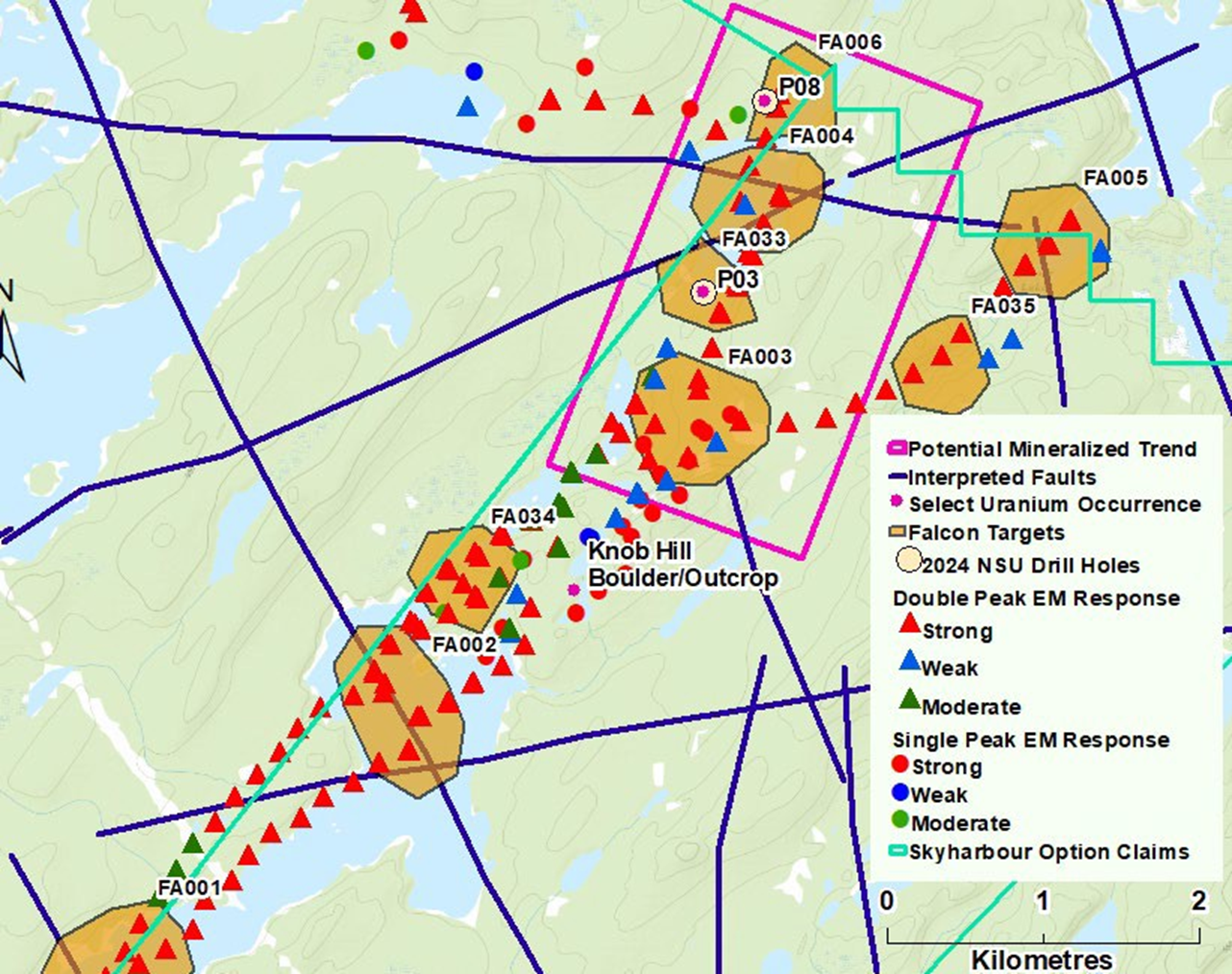 Furthermore, in 2022, Skyharbour completed a FALCON® airborne gravity gradiometer and magnetic survey over nine of the eleven claims at the Falcon Property. This new geophysical data will assist North Shore in prioritizing areas along the EM conductor system for drilling. Over 30 kilometres of the EM conductor system remains untested on the Falcon Property. North Shore’s initial focus will be on the two claims formerly part of the Foster Project (geophysics), and on generating drill targets on three claims at the southeastern end of the EM conductor systems including Knob Lake, which shows similarities to the Fraser Lakes Zone B deposit approximately 6 km to the northeast and several other high-priority targets elsewhere along the main EM conductor system.