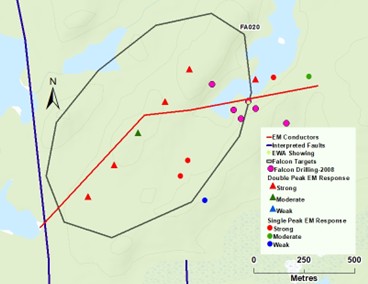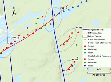 Target FA019, which is located at the eastern edge of the Property, is a 700 m long, strong EM conductor that is parallel to, and one km south of the main EM conductor trend at Falcon (Figures 1 and 5). The conductor is terminated at its western end by an interpreted prominent north-south-trending fault zone. The prospecting crew found one radioactive boulder that registered close to 7,000 cps on the scintillometer at this location. The granitic gneiss boulder had a 10 cm wide quartz vein with a mica-rich contact that displayed hematite alteration. The interpreted trace of the conductor roughly corresponds with an east-west-trending boulder train within a stream drainage.