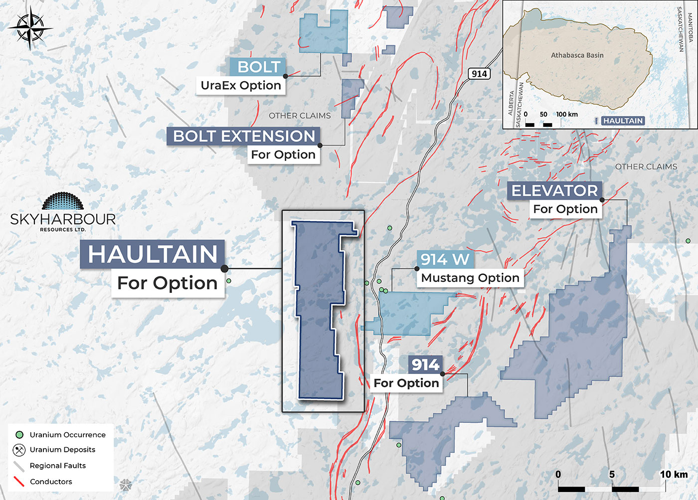 The Haultain Project comprises five newly staked claims totalling 6,607 hectares, located approximately 46 km southwest of Cameco’s Key Lake Operation and 3 km west of Highway 914. Situated in the Mudjatik Domain just outside the currently mapped extent of the Athabasca Basin, the property is predominantly underlain by orthogneisses, with historical EM conductors and coincident magnetic lows possibly indicating the presence of graphitic pelitic gneisses on the property. Limited modern exploration has been conducted on the Haultain Project beyond early-stage prospecting, mapping, and geochemical sampling. The project is prospective for basement-hosted unconformity-related uranium mineralization, as well as pegmatite-hosted U-Th-REE mineralization.