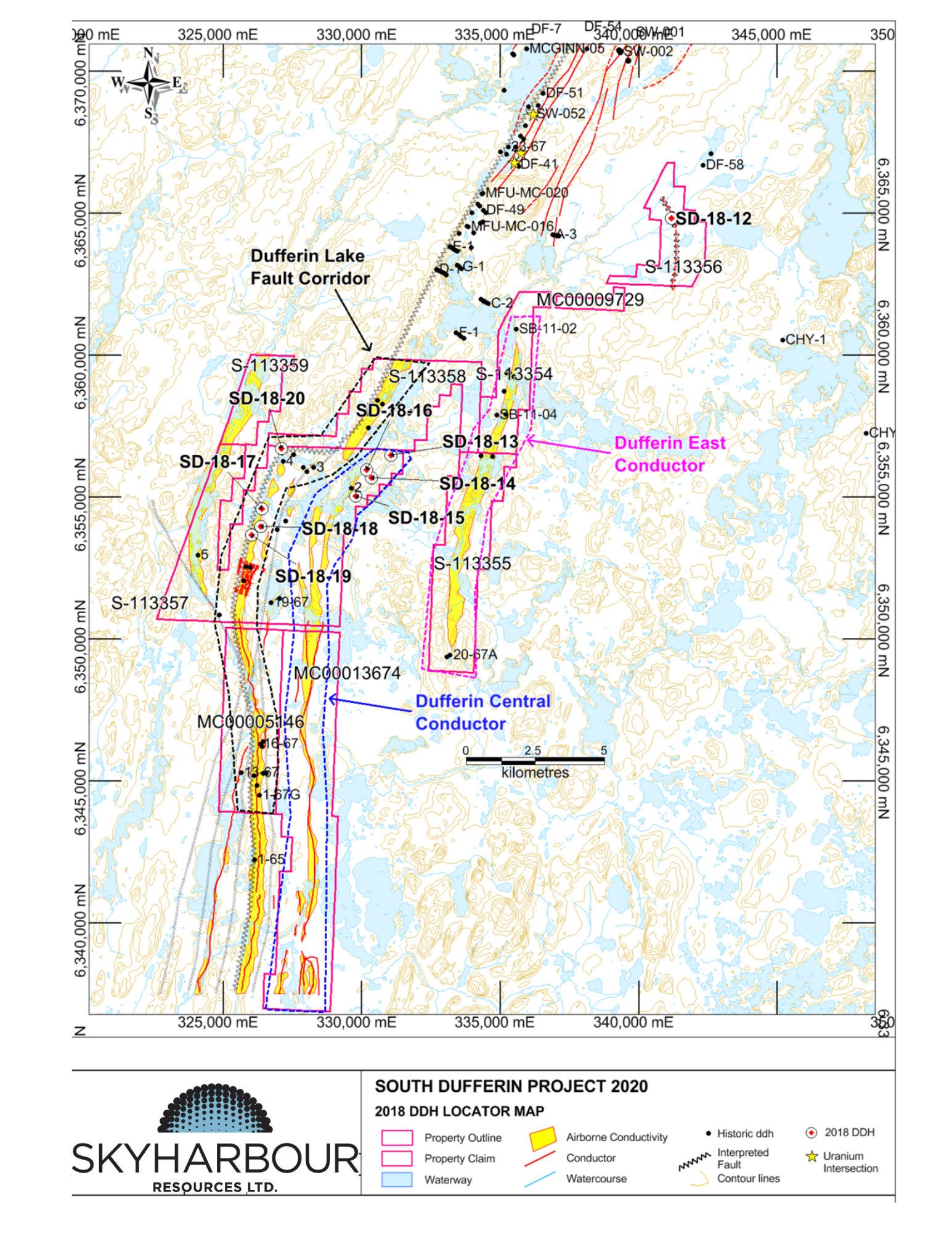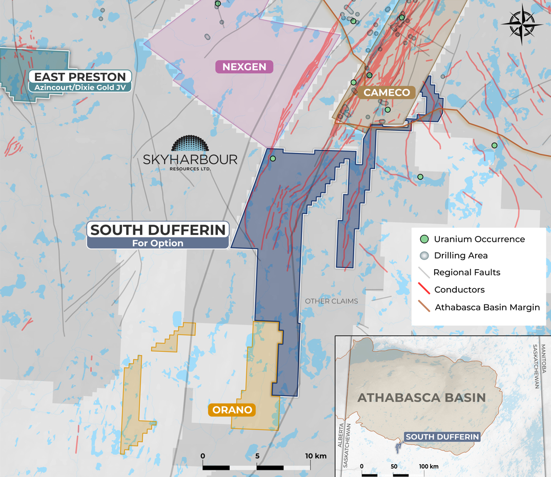 Vancouver, BC - Skyharbour Resources Ltd. (TSX-V: SYH)  (OTCQX: SYHBF) (Frankfurt: SC1P) (the “Company”) is pleased to announce that it has acquired 100% of the South Dufferin Uranium Project (“South Dufferin” or the “Project”) from Denison Mines Corp. (“Denison”). The South Dufferin Project comprises 12,282 hectares (30,349 acres) over nine claims in the Athabasca Basin, which is host to the highest-grade uranium deposits in the world and is consistently ranked as a top mining jurisdiction by the Fraser Institute.