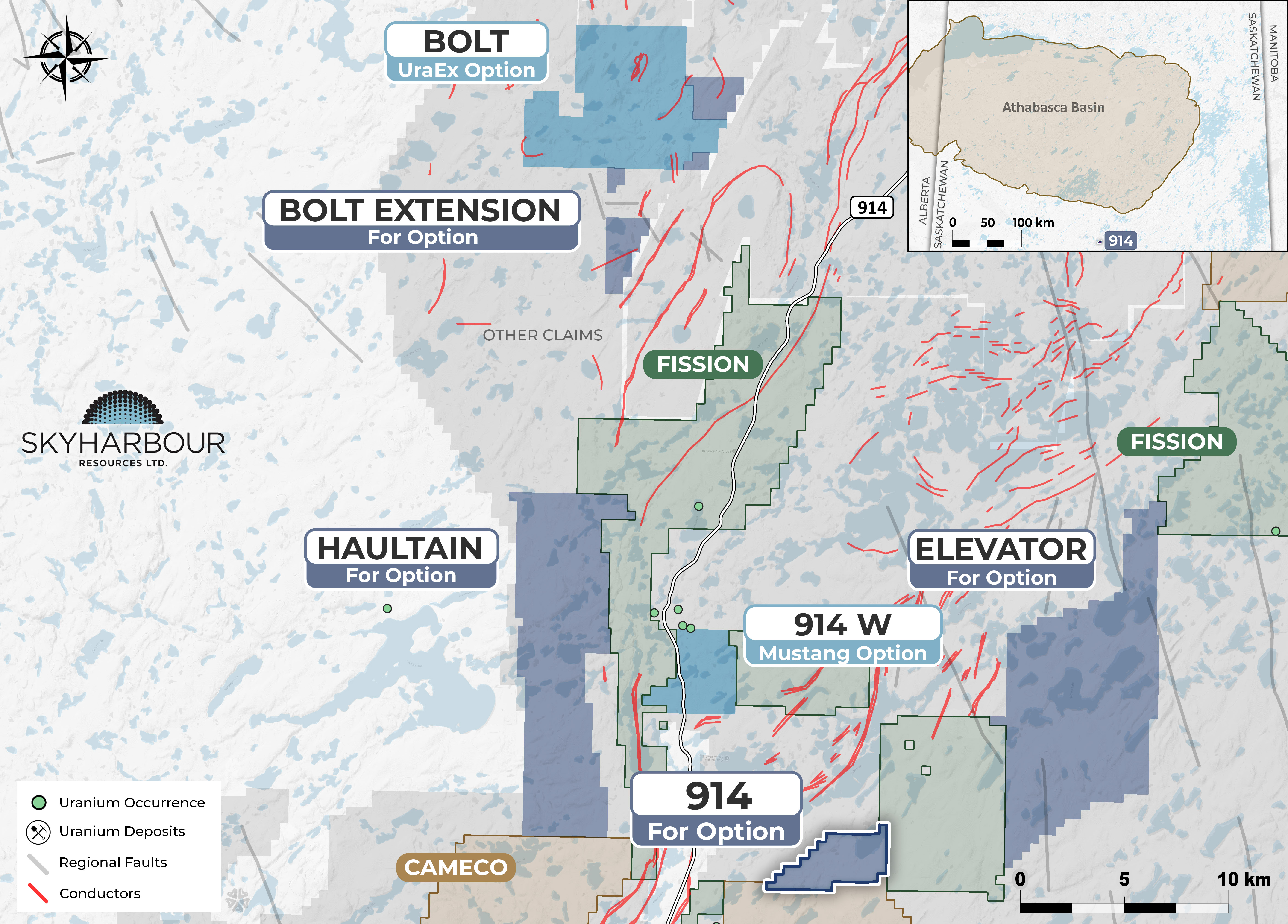 The 914 and Elevator projects consist of five recently re-staked, non-contiguous claims totalling 9,145 hectares, located 35 to 55 km south of Cameco’s Key Lake Operation. Both projects lie near Provincial Highway 914, providing access to southern Saskatchewan. The 914 Project, comprising three claims totalling 1,133 hectares, is situated 1 km east of the highway, while the Elevator Project, with two claims totalling 8,012 hectares, lies 15 km east.