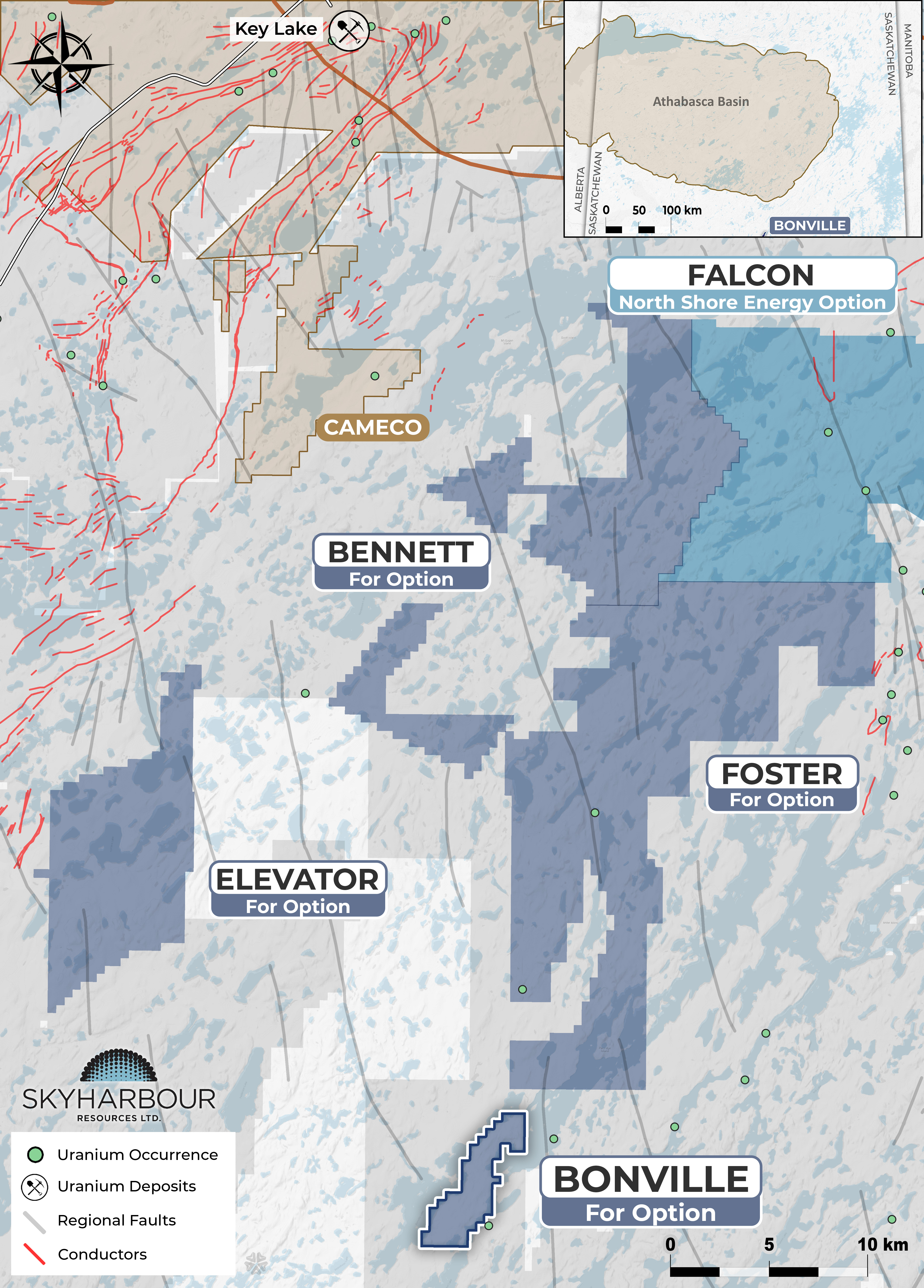 The Bonville Project consists of a single newly staked claim totalling 1,497 ha and is located approximately 60 km south of Cameco’s Key Lake Operation. The Bonville project is located in the Wollaston Domain outside of the currently mapped extent of the Athabasca Basin, and mapping indicated the property is underlain by predominantly Wollaston Supergroup metasedimentary gneisses, including prospective locally graphitic lower Wollaston Supergroup pelitic gneisses. Historical exploration includes airborne magnetic and EM surveys, geochemical sampling, and prospecting dating back to the 1960s and 1970s. The property hosts three minor copper occurrences (Bonville Lake Cu, SMDI 989). It is considered prospective for basement-hosted uranium mineralization, as well as pegmatite-hosted U-Th-REE and sediment-hosted copper mineralization.