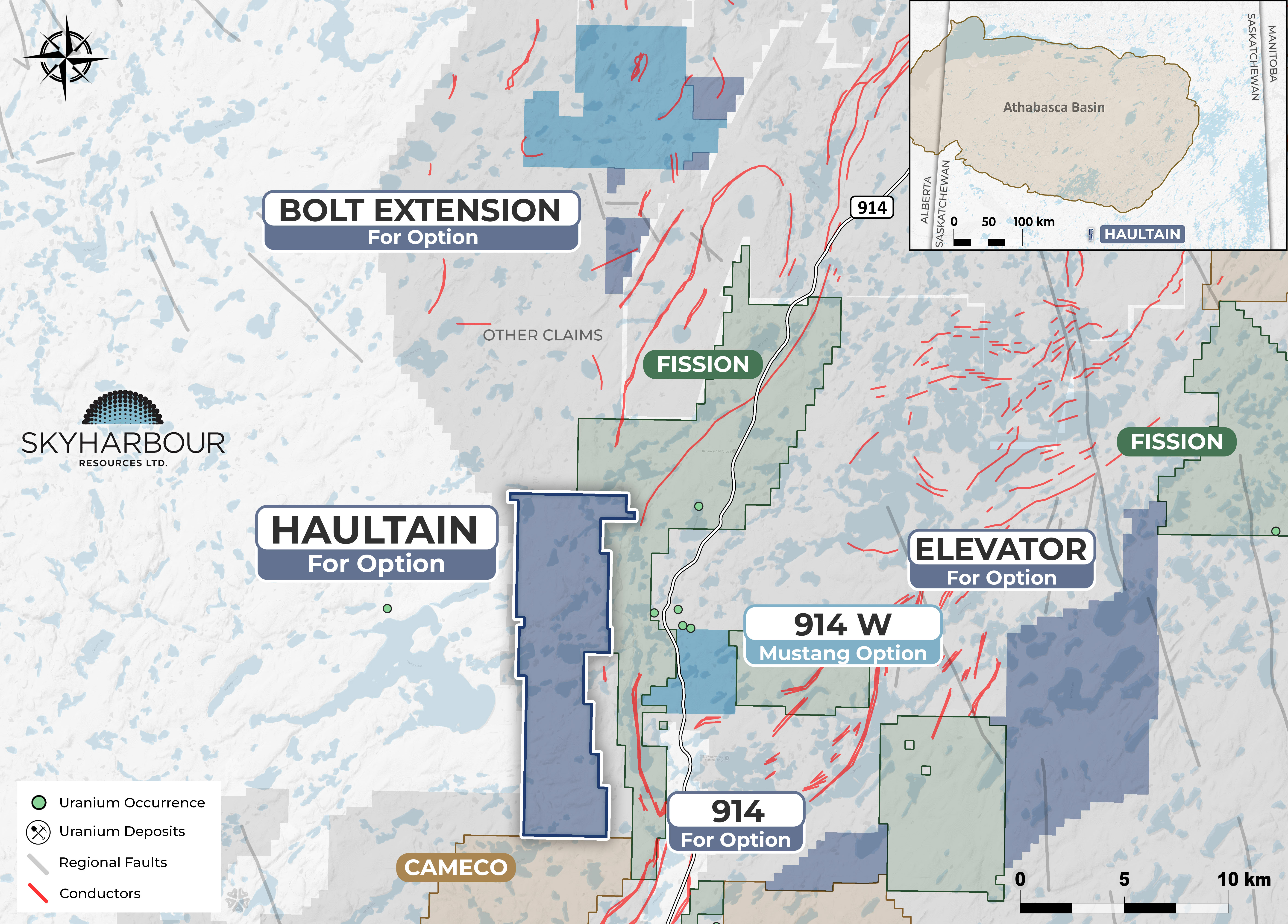 The Haultain Project comprises five newly staked claims totalling 6,607 hectares, located approximately 46 km southwest of Cameco’s Key Lake Operation and 3 km west of Highway 914. Situated in the Mudjatik Domain just outside the currently mapped extent of the Athabasca Basin, the property is predominantly underlain by orthogneisses, with historical EM conductors and coincident magnetic lows possibly indicating the presence of graphitic pelitic gneisses on the property. Limited modern exploration has been conducted on the Haultain Project beyond early-stage prospecting, mapping, and geochemical sampling. The project is prospective for basement-hosted unconformity-related uranium mineralization, as well as pegmatite-hosted U-Th-REE mineralization.