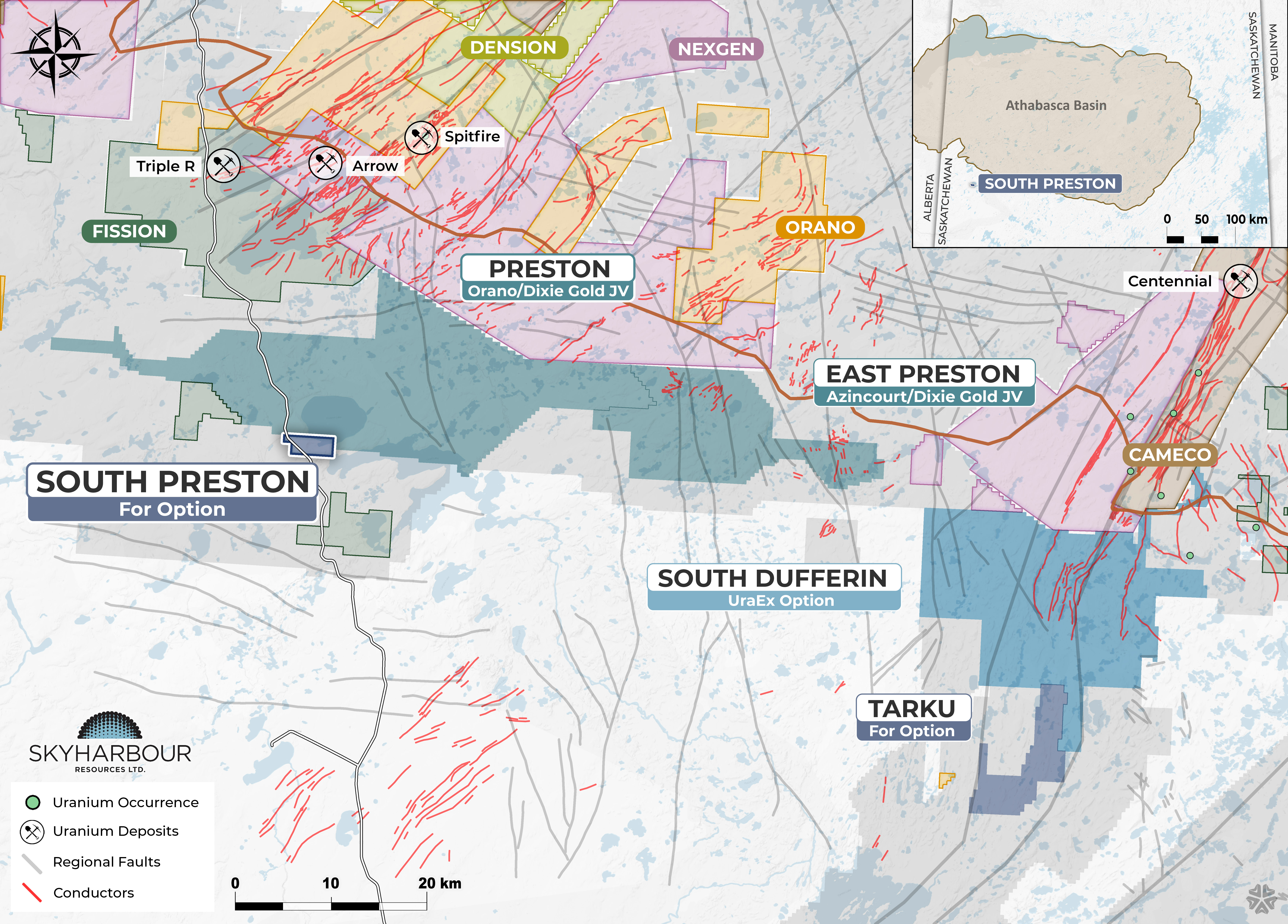 The South Preston Project consists of one claim totalling 965 hectares, located approximately 30 km south of the Athabasca Basin and adjacent to Skyharbour and Orano Canada’s Preston Joint Venture. It is underlain by Taltson felsic granulites and Cretaceous Manville Group sandstones and mudstones. Exploration to date has been limited, comprising airborne EM, magnetic, and radiometric surveys, along with limited prospecting and geological mapping. A series of EM conductors extend onto the property from the adjacent Preston JV but remain untested by drilling.